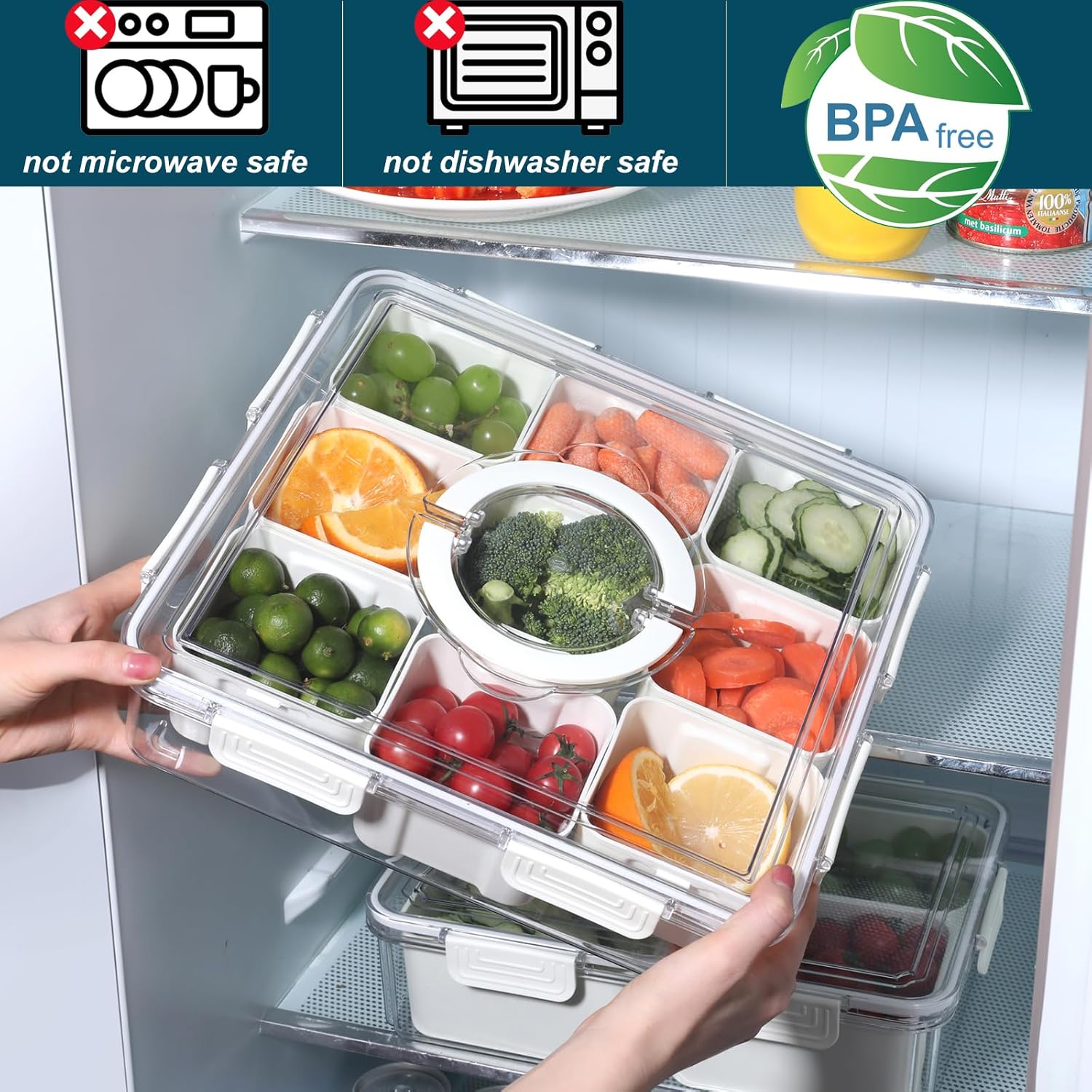 - Airtight Lid: The lid of the veggie tray features a silicone ring seal and 6 reinforced snaps for excellent air tightness and leak proof. Effectively prevents dust and odors, keeping produce fresh