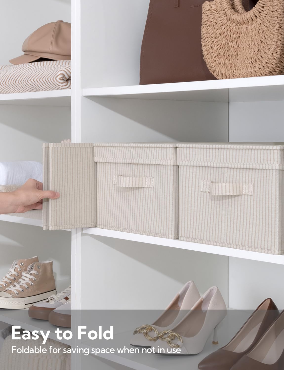 StorageWorks Large Storage Bins with Lids, Decorative Storage Boxes with Lid and Handles, Foldable Storage Baskets for Closet, Shelves, Stackable, Khaki Stripe, 3-Pack