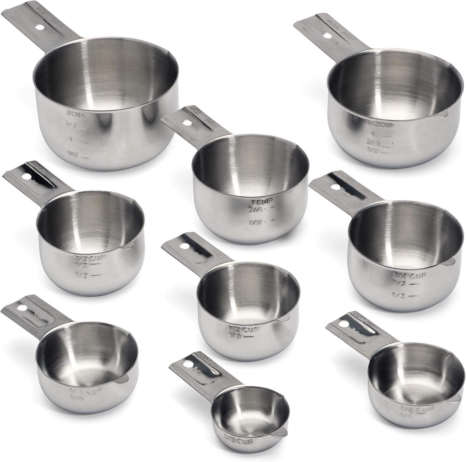 - Complete set of nine: includes 1/8, 1/4, 1/3, 1/2, 2/3, 3/4, 1 , 1.5, 2 cup premium stainless steel measuring cups