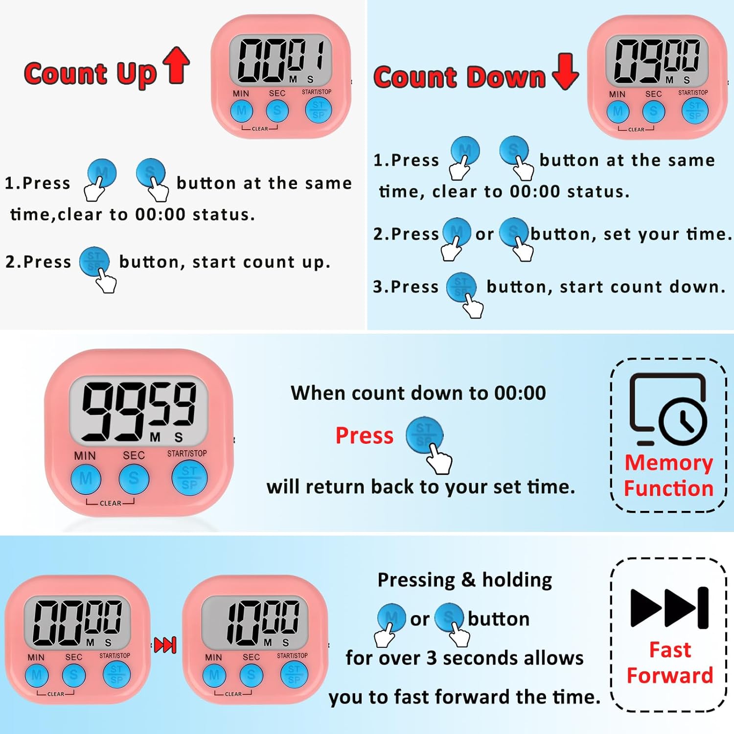 - Digital Timers: Large screen, bold digits for easy read and the buzzer is loud that you can hear clearly even in another room to remind you on time.