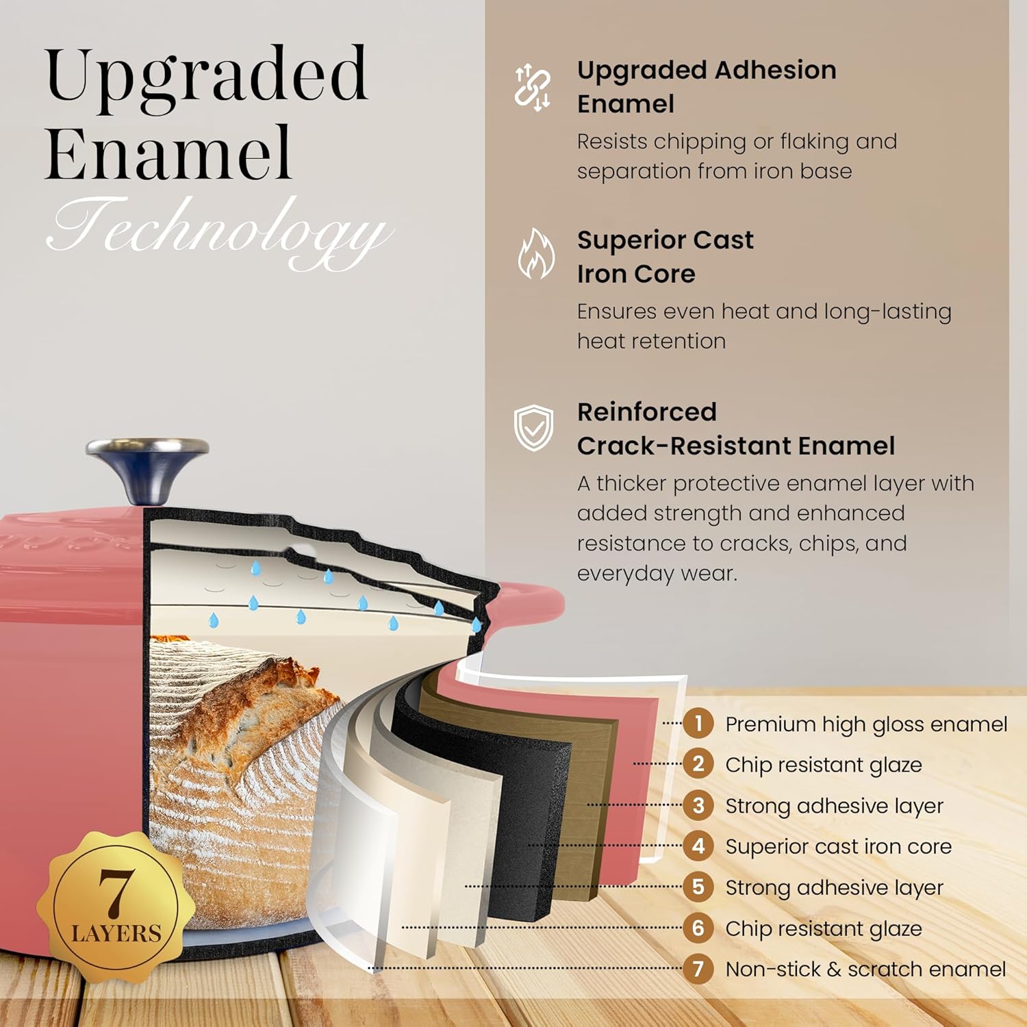 Nuovva Enamelled Cast Iron Dutch Oven Pot with Lid 6.4 Quart Non Stick Casserole Pot – Heavy Duty & Oven Safe up to 500° F for Bread Baking, Braising, Stews, Roasting – 28cm Pink