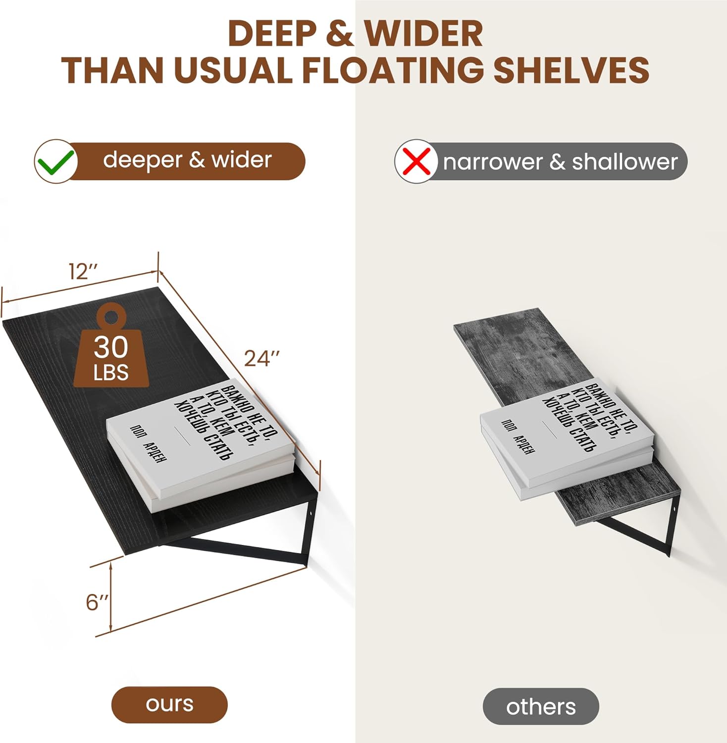 - [Size Does Matter] - These wall shelves are wider and longer than regular shelves on the market, providing more room and worry-free storage! Measures: 24Wx12Dx5.8H Easy to install within a few minutes with all necessary hardware included.