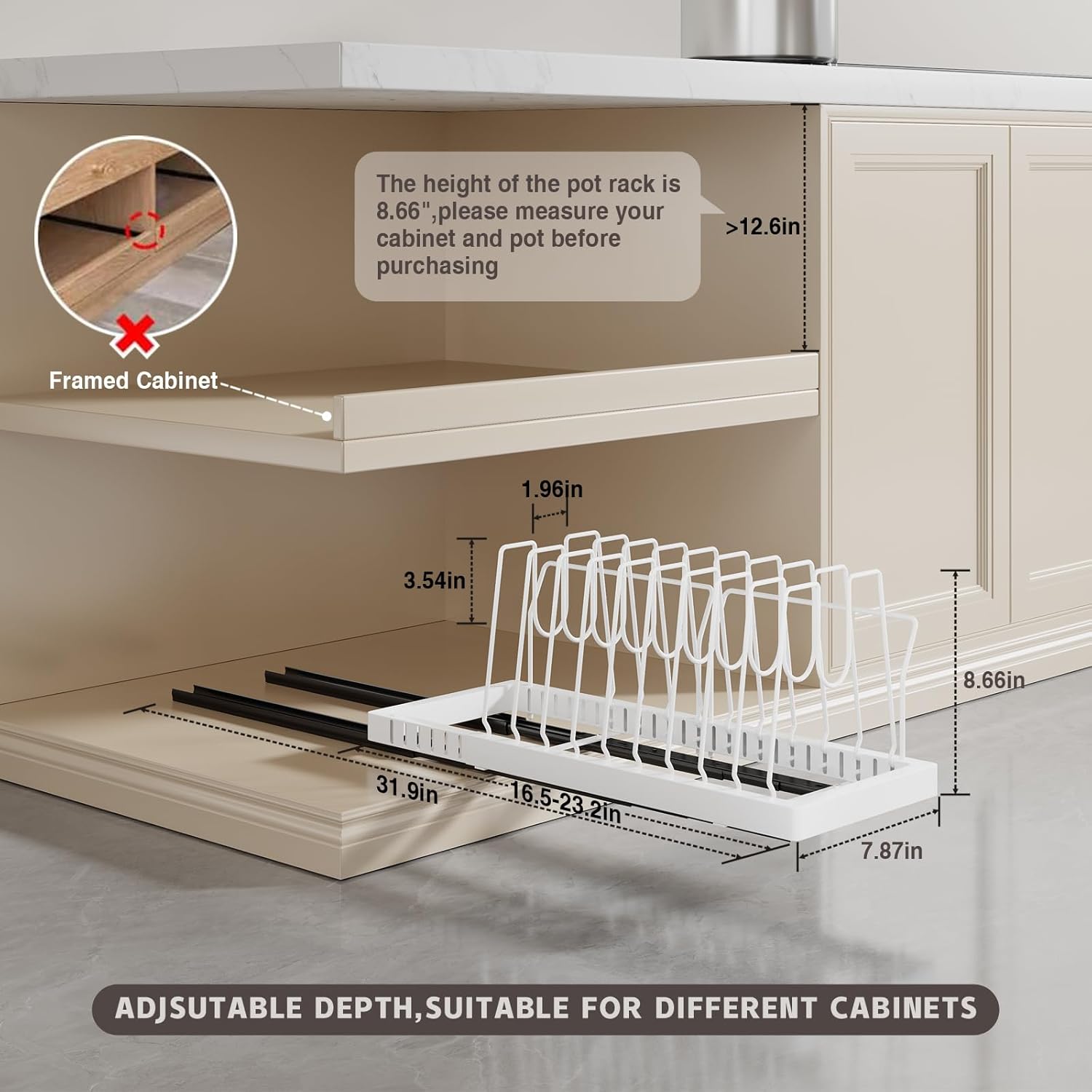 - 【Expandable Depth & Adjustable Dividers】This pots and pans organizer under cabinet is an expandable depth design, which measures (16.54 D"~23.23" D)*7.87" W*8.66" H, you can adjust the size according to the depth of the cabinet, making full use of your cabinet space. It contains 10 adjustable U-dividers and can hold at least 9 items, such as pots, pans, cutting boards, lids, etc. Providing a super large storage capacity, Providing a clean and tidy kitchen environment.
