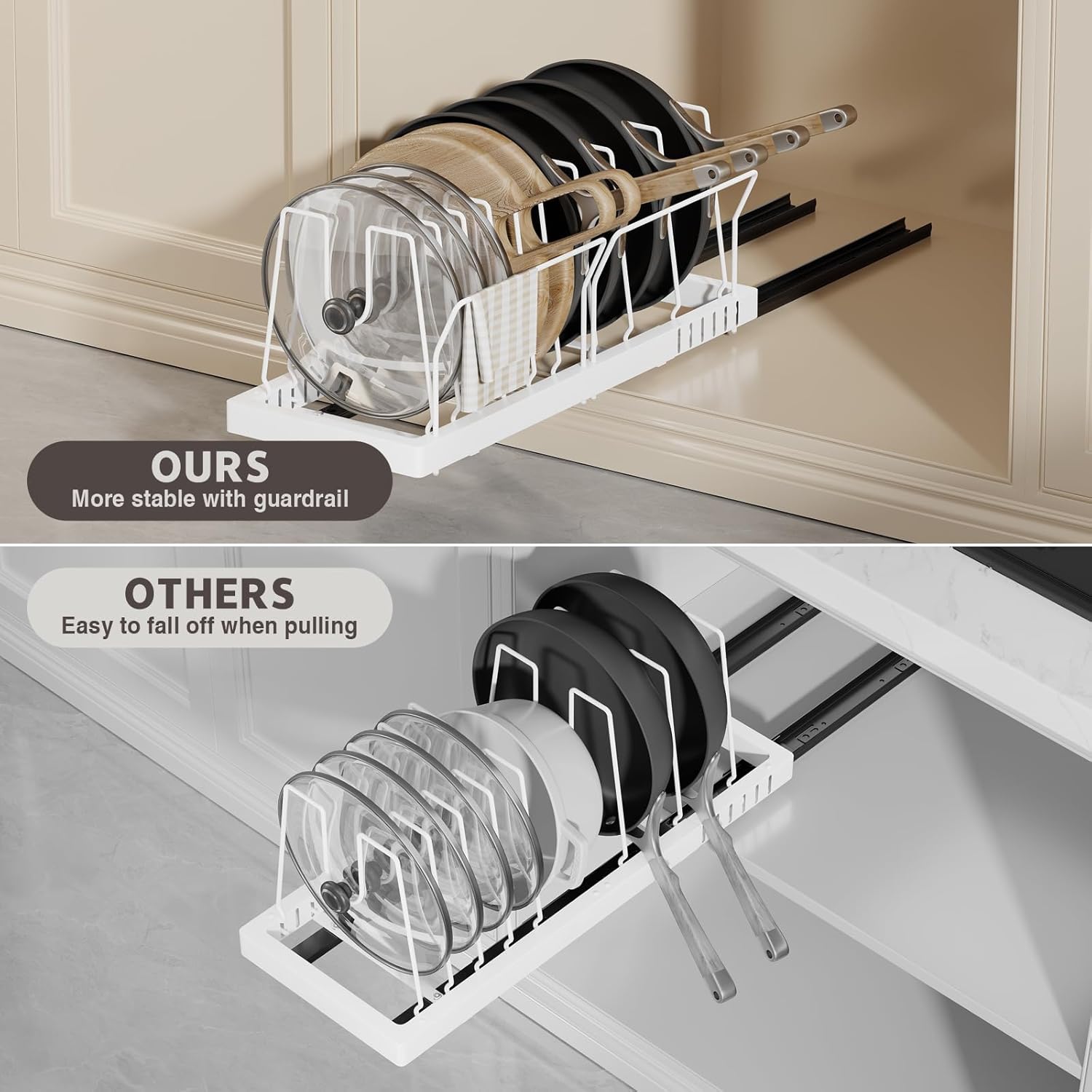 - 【Customized Guardrail/Handle Bracket】The Pull-out pot lid organizer has a unique design and exclusive patents. It is equipped with 2 adjustable Guardrail/handle brackets to support the handles of pots and pans to ensure their safety, stability, and sturdiness. The brackets can be adjusted freely, and you can install them on the left or right side according to your needs. You can also hang dish towels on them.
