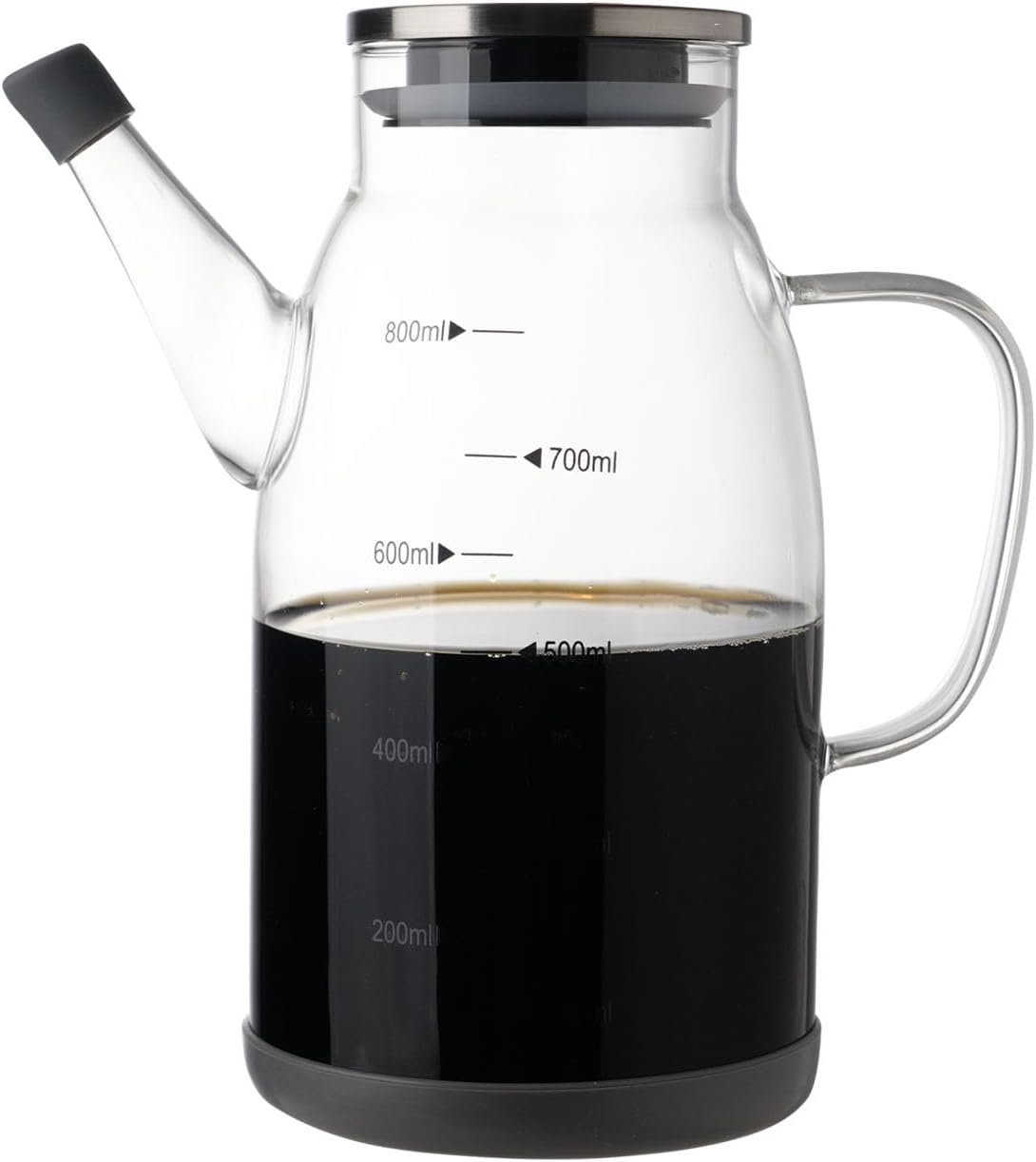 - 【Perfect design】Our olive oil dispenser, with a stainless steel lid. The oil jug has a milliliter scale that allows you to control the amount of olive oil or vinegar you use while cooking. We also have a silica cap that keeps out the dust, and a silica base that prevents collisions. let you use it in the kitchen, safe rest assured.