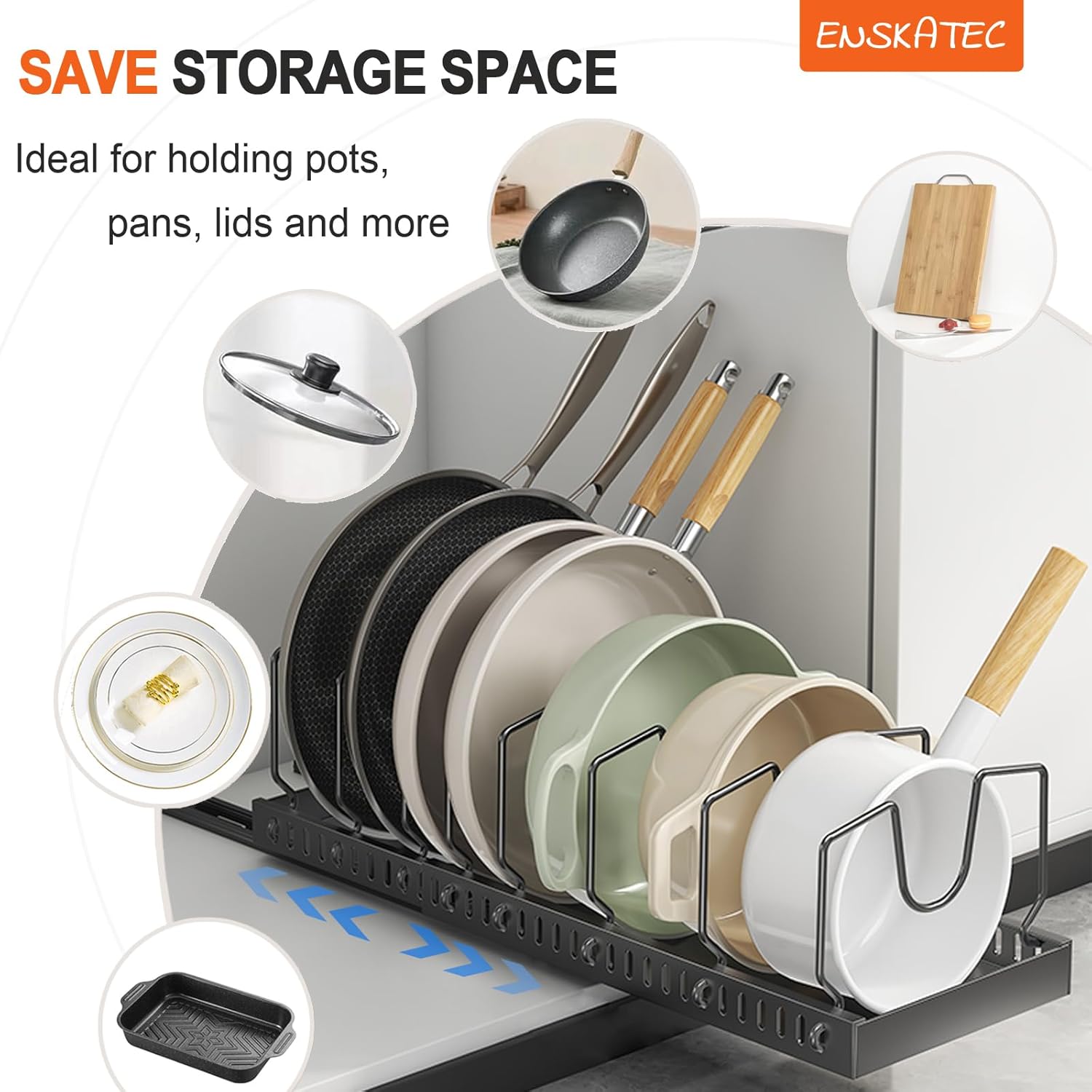 - 【10 Adjustable Dividers】Pots and pans organizer under cabinet is equipped with 10 adjustable dividers, allowing you to freely adjust the width of the storage according to the size of the pot and lid.This saves your kitchen use space and gives you a neat kitchen.