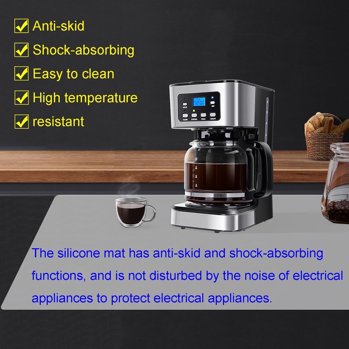 - 5.Two-sided design: The silicone pad has a glossy surface on one side and a matte surface on the other. When using it, turn the glossy side down to fit the countertop tightly, which is the best for non-slip. If it is a glass tabletop, you need to slowly expel the bubbles.