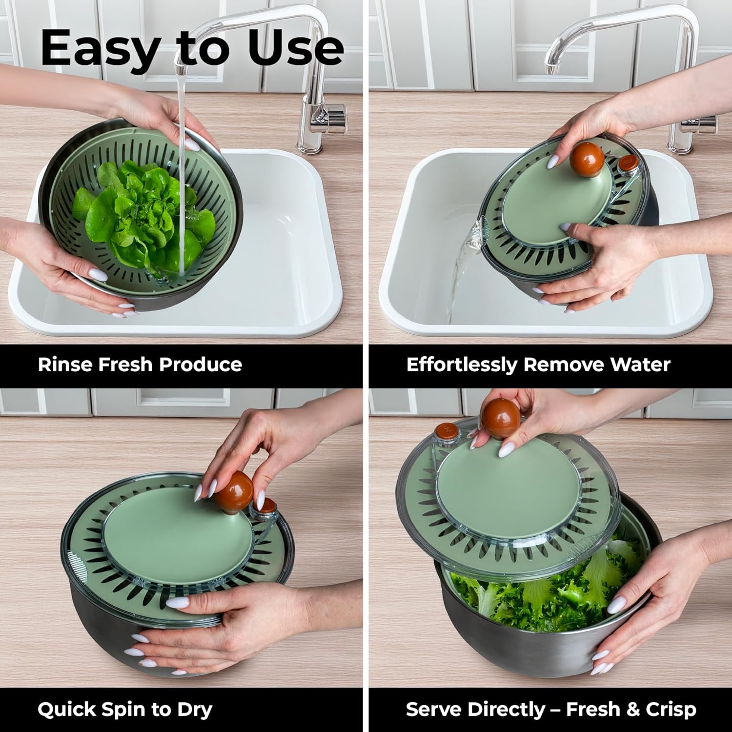 - MULTI-PURPOSE DESIGN - The stainless steel salad spinner inner basket doubles as a colander, and the steel bowl because its large capacity can be used for cooking other foods, as mixing bowl or serving bowl.