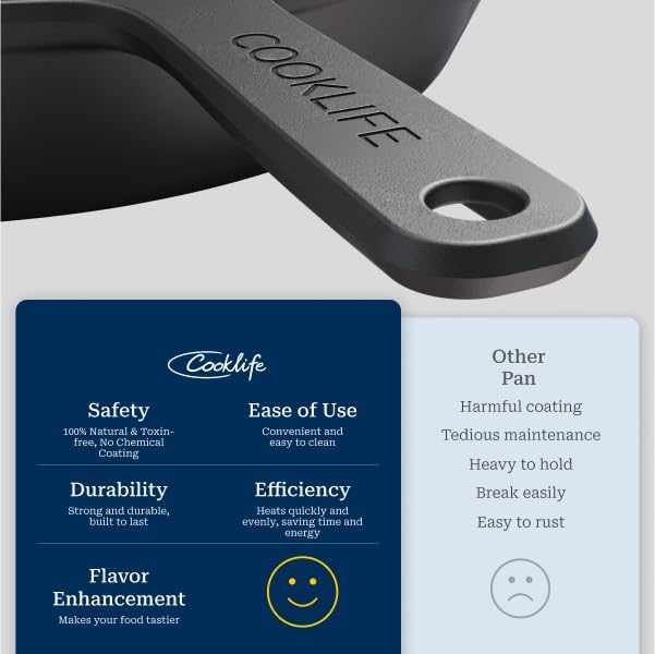 - Healthy Choice for Your Kitchen: COOKLIFE cast iron pan is completely free of harmful chemicals like PFAS, PFOA, PTFE, PFOS, and Teflon, ensuring a safe and healthy cooking experience for you and your family. The smooth-polished surface combines modern technology with the time-tested quality and performance of traditional cast iron.