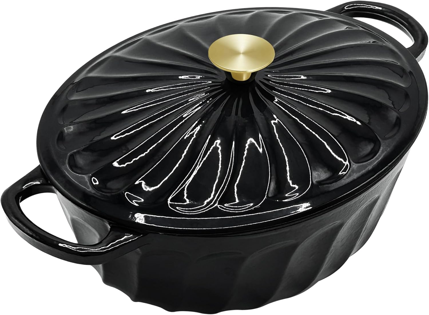 - Enclosed Thermal Circle: The oval dutch oven casserole dish pot has a raised pattern of water ripples on the inside, which makes this non-stick enameled casserole oval oven have superior heat distribution and retention, evenly heating throughout both the bottom and sidewalls. The tightly-fitted lid allow water vapor circulates and locks inside the enameled oval dutch oven pot, fully releasing the flavor and nutrients of the ingredients, possess pretty heat retention performance