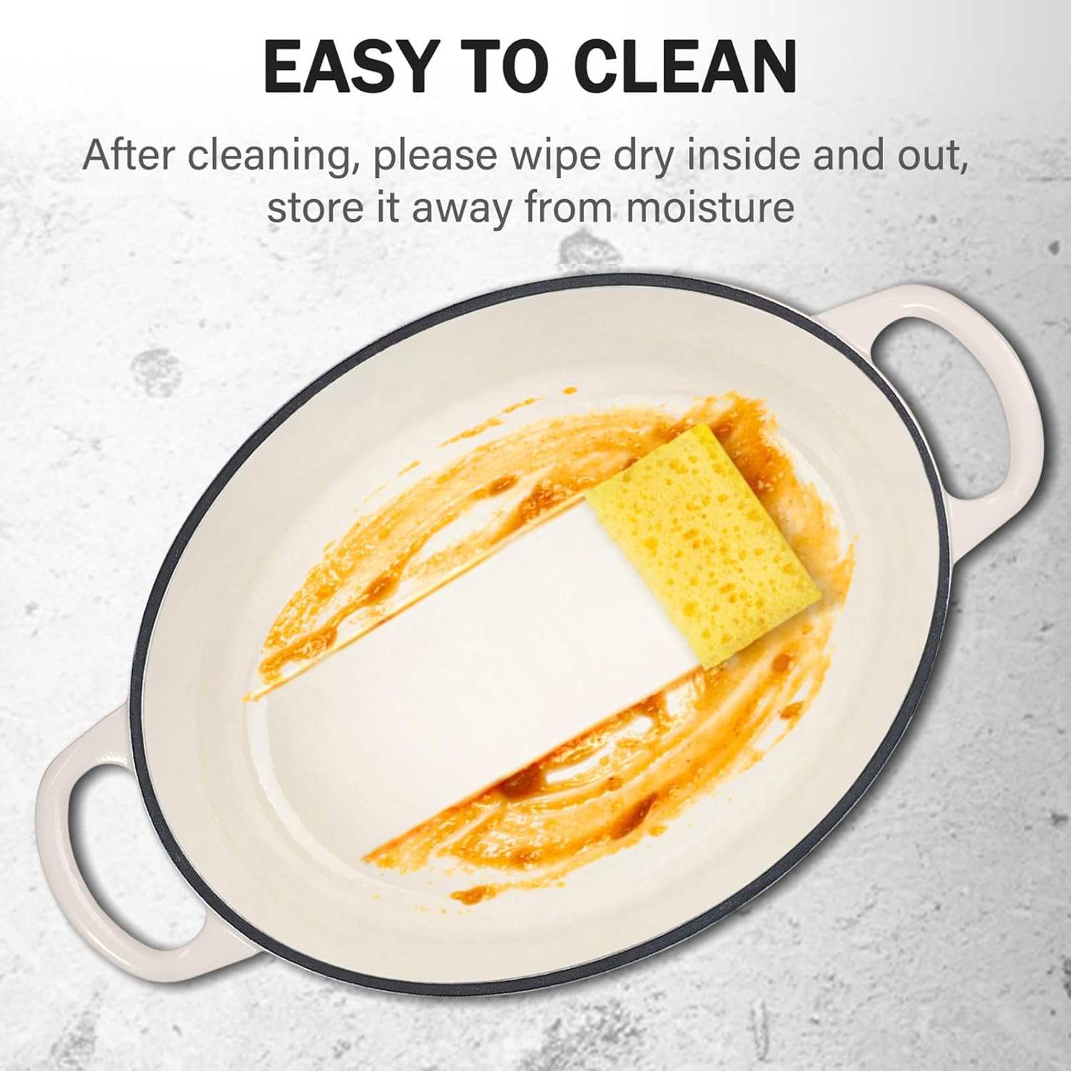 - Easy to clean: The outer layer of this oval ceramic coated cast iron pot is a non adhesive coating that minimizes sticking and makes it easy to clean with a soft sponge or cloth. If you want to remove stains that are difficult to remove, you can soak the non-stick emaneled dutch oven pot in warm water for 1 to 2 hours or more, and then use baking soda or neutral detergent to remove them