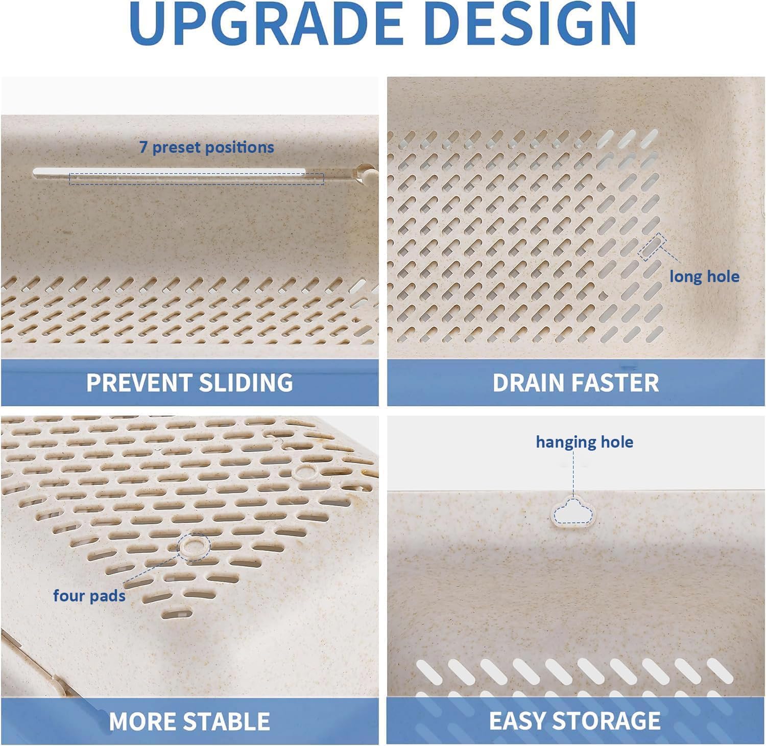 - LASSHSWA upgrade the colander, 7 preset positions - PREVENT SLIDING, long hole - DRAIN FASTER, four pads - MORE STABLE, hanging hole - EASY STORAGE.