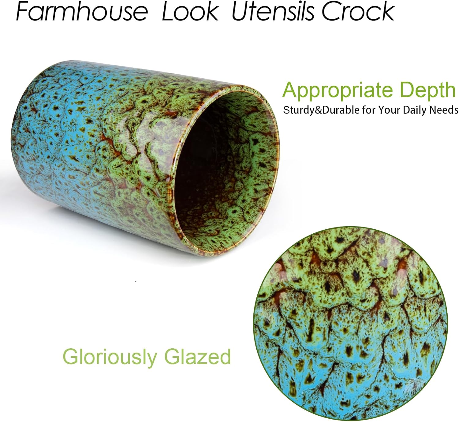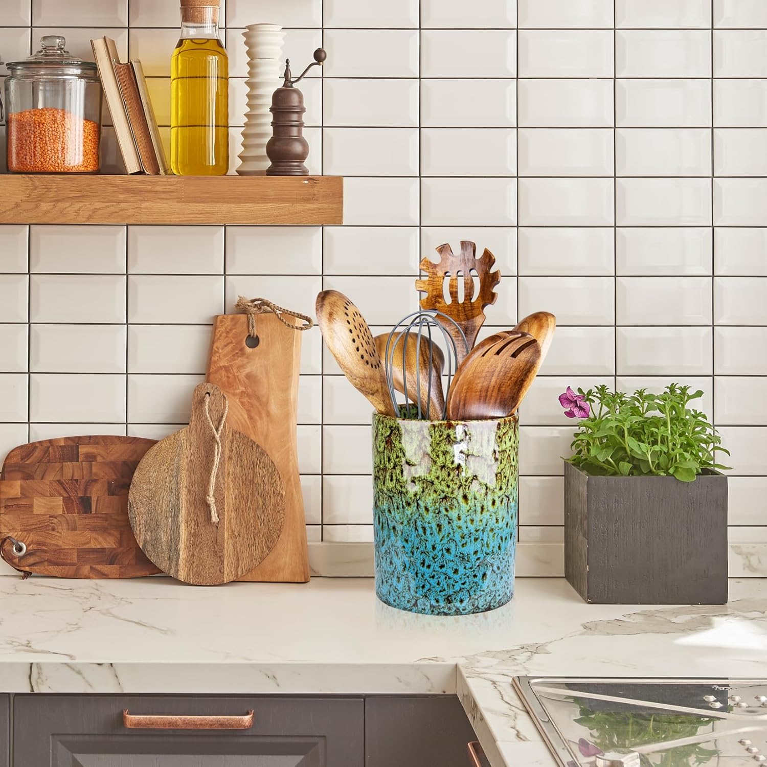 Utensil Holder, Ceramic Kitchen Utensil Holder for Countertop, Large Cooking Utensil Crocks for Kitchen Counter, Morden Utensil Organizer for Spatula, kitchen Decor,Green & Blue