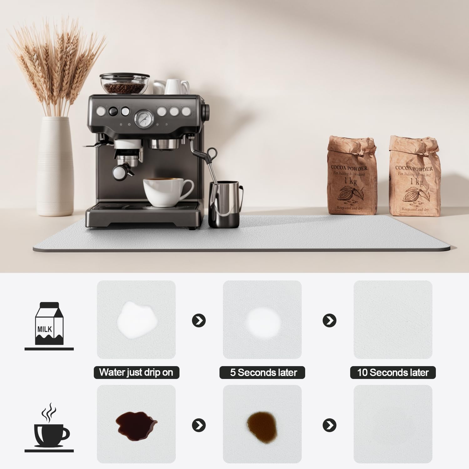 - 【Fast Drying】 The coffee mat features highly absorbent nano-material, allowing it to air-dry within seconds and keeping your countertop neat at all times.
