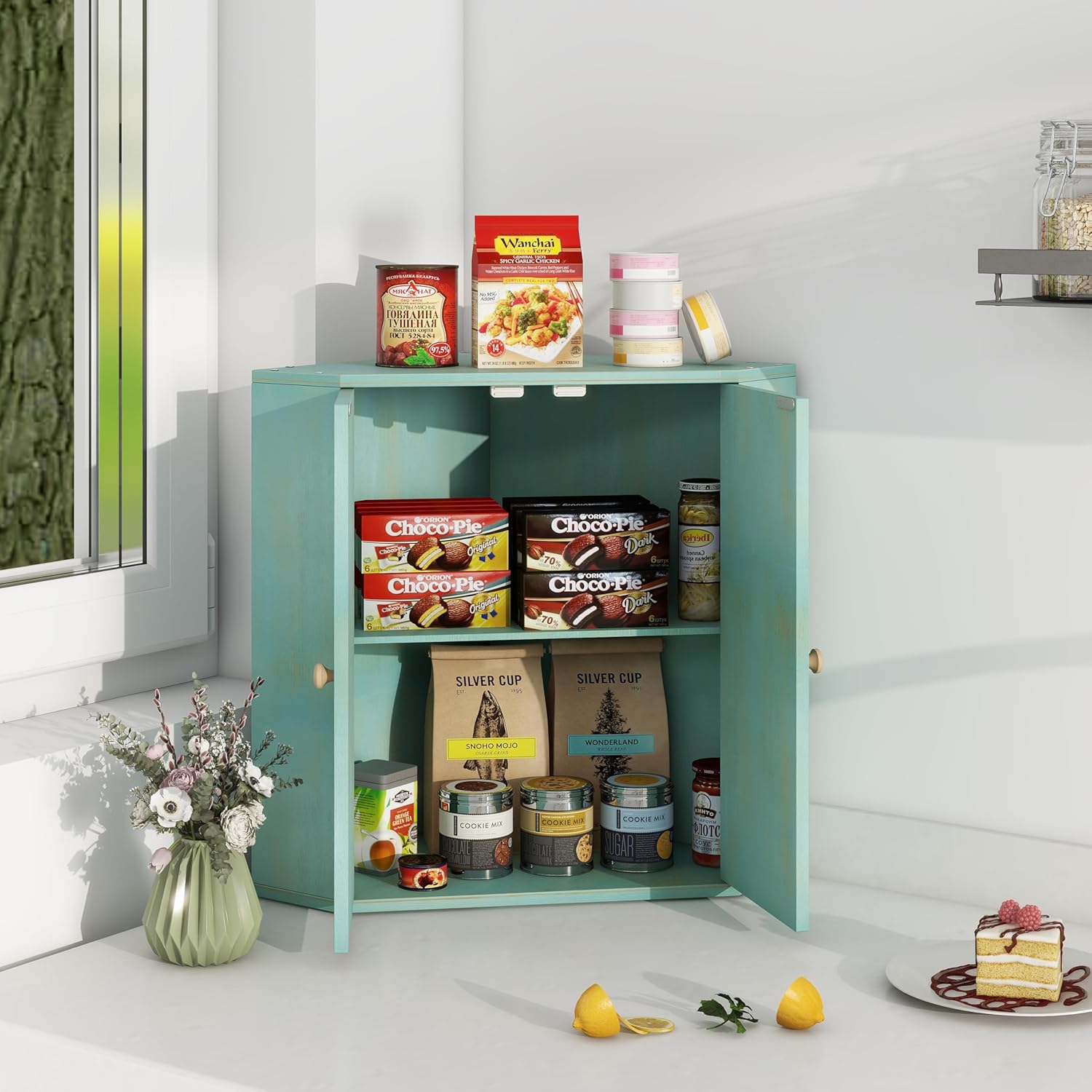 Corner Bread Box for Kitchen Counter Double Layer Bamboo Bread Storage Container Large Capacity Bread Storage Bin Farmhouse Breadbox Organizer (Antique Blue)