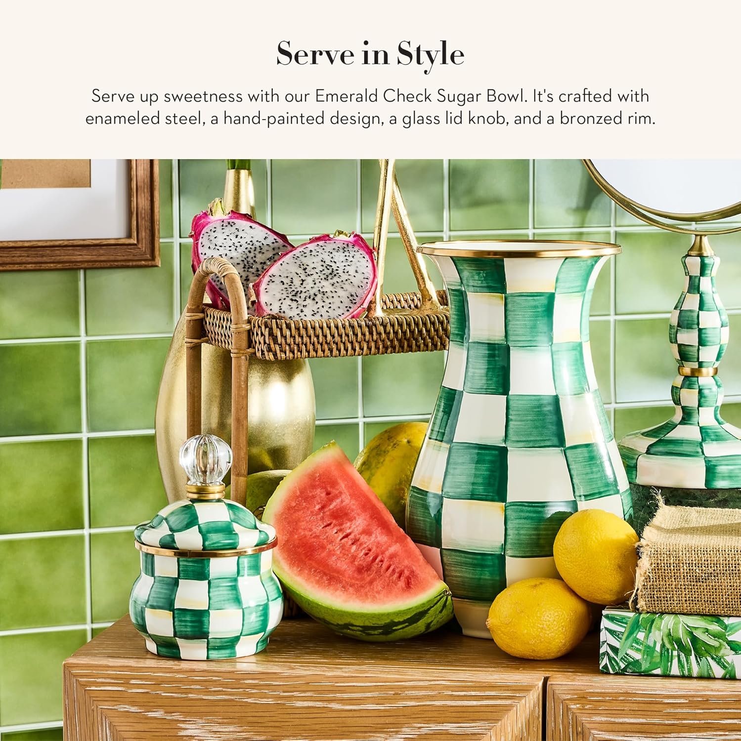- SERVING ESSENTIALS: Sugar or any other spice will look great in this small bowl. It features our enchanting Emerald Check pattern with pretty hand-painted high-contrast green-and-white checks on enameled steel. The lid is topped with a glass knob.