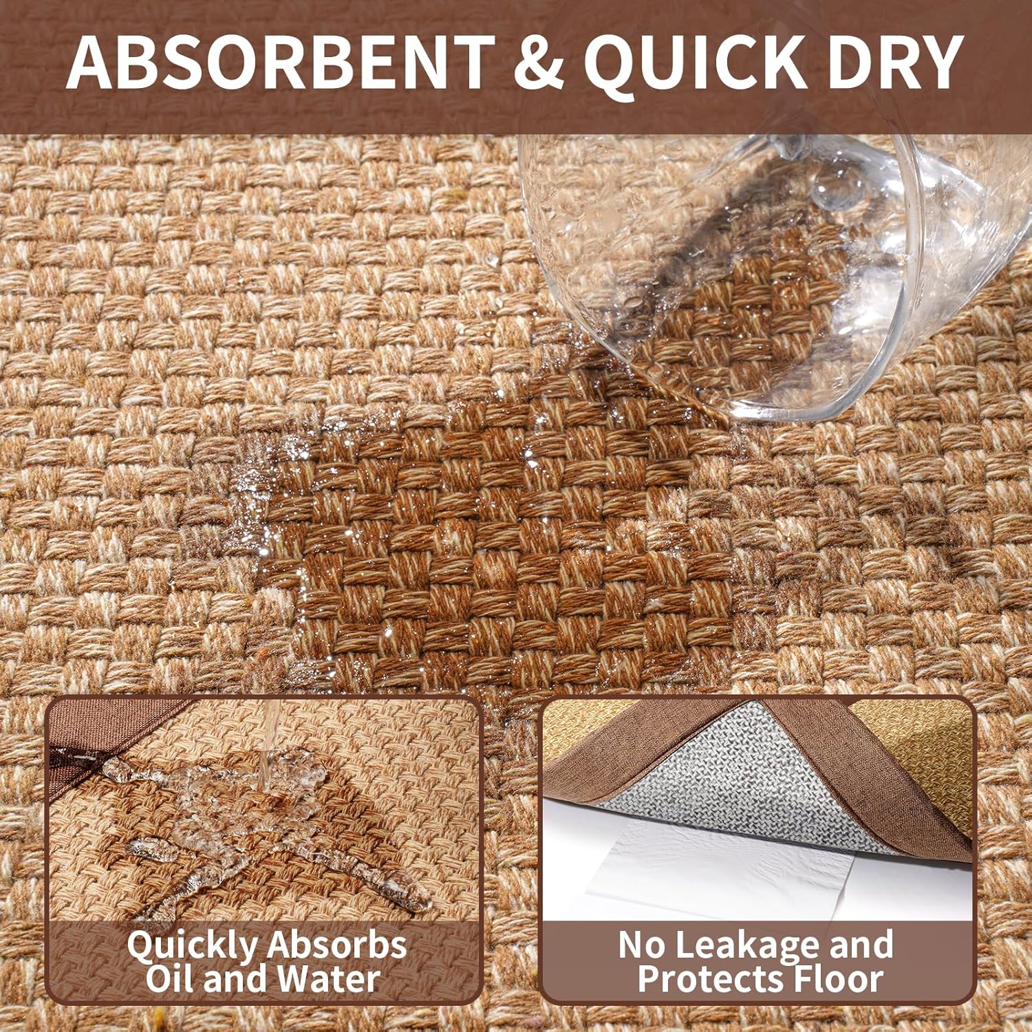 - Super Absorbent Quick Drying Kitchen Rugs - This water absorbent kitchen rugs with a woven surface absorbs dripping oil and water, making it easy to handle spills and moisture. Good water absorption and stain resistance protects the floor from grease, moisture, sauces or food particles, keeping the kitchen tidy and adding an extra layer of safety to the kitchen.