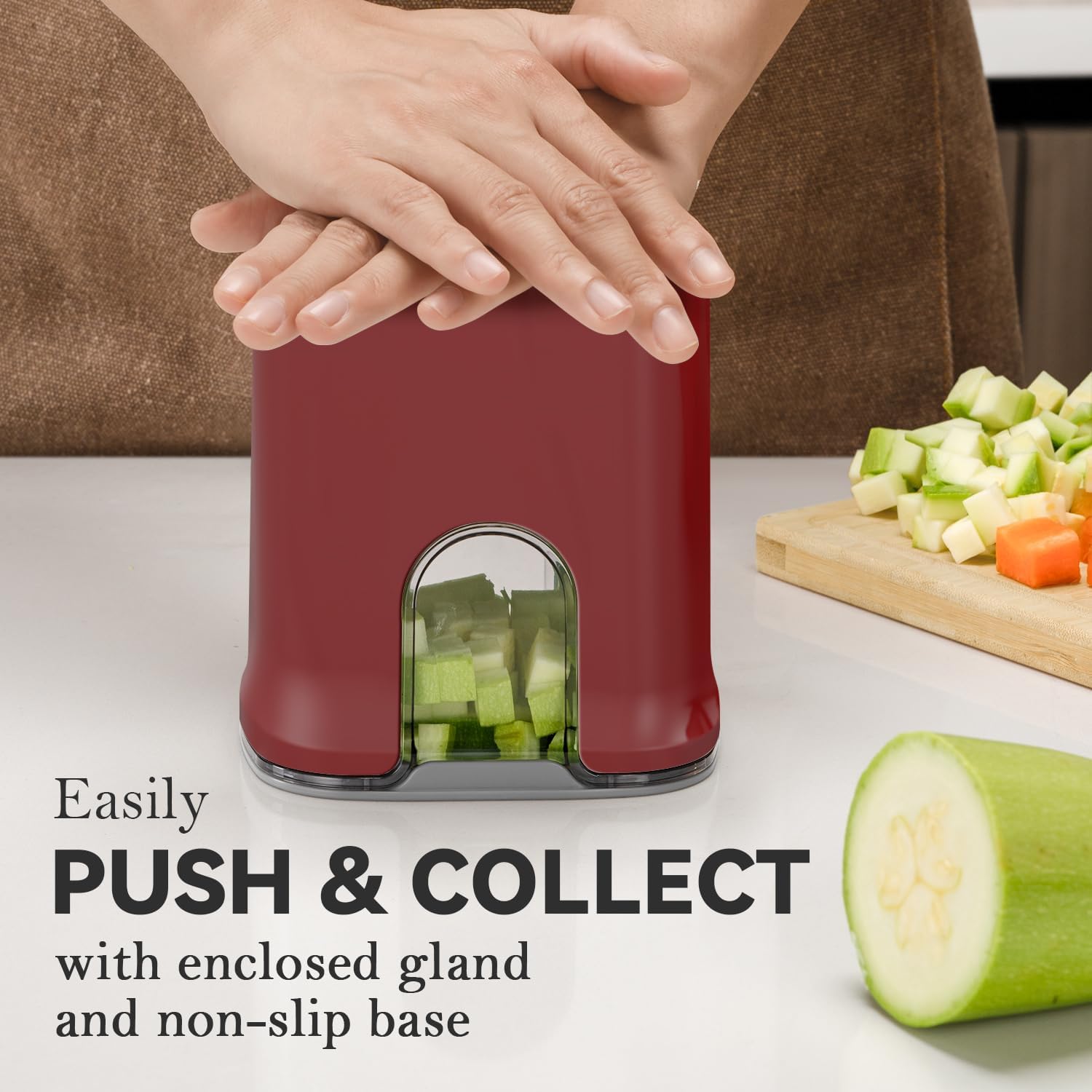 - Compact Storage Design: The clear collection box collects all chopped ingredients as well as storing all blades in it after use. The finished size of the vegetable chopper box after storage is only 4.7"*3.9"*5.1". It's about the size of a mug and you can simply store it in a drawer or cabinet. Please dry it after washing before storing it to avoid moisture and bacteria.