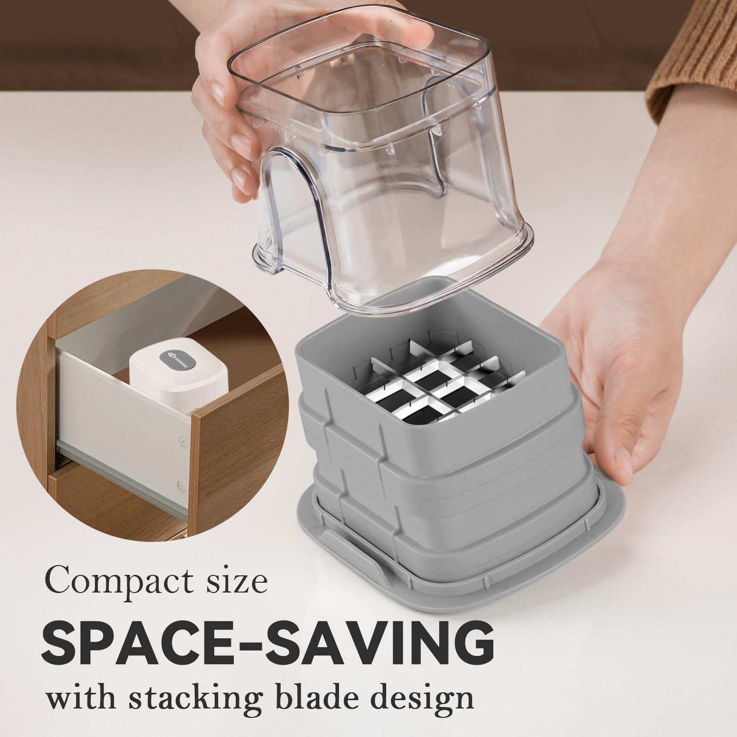 - Compact Storage Design: The clear collection box collects all chopped ingredients as well as storing all blades in it after use. The finished size of the vegetable chopper box after storage is only 4.7"*3.9"*5.1". It's about the size of a mug and you can simply store it in a drawer or cabinet. Please dry it after washing before storing it to avoid moisture and bacteria.