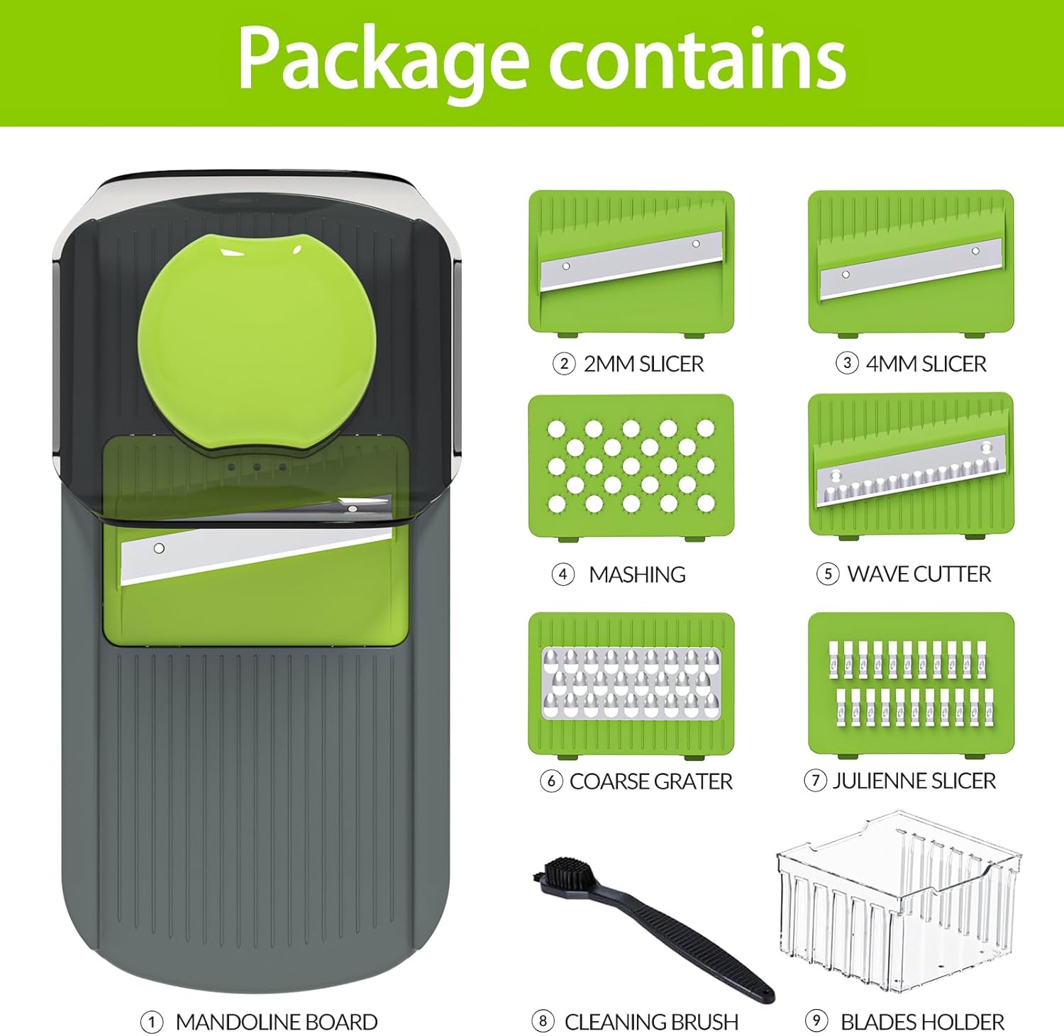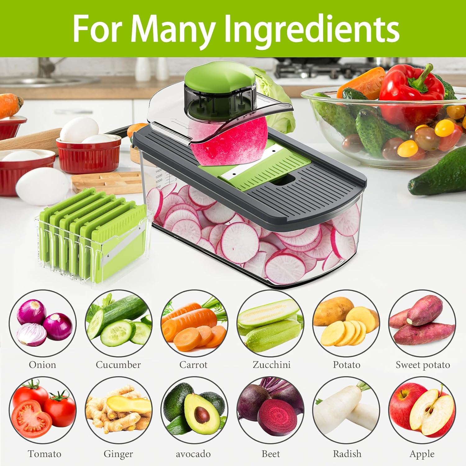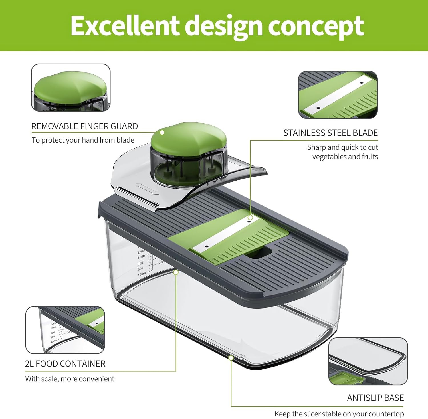 - Capacity:Also comes with a finger guard to protect your fingers and a knife holder boxes for storage. 2L containers can hold more vegetables;At the same time, all the accessories can be stored in it