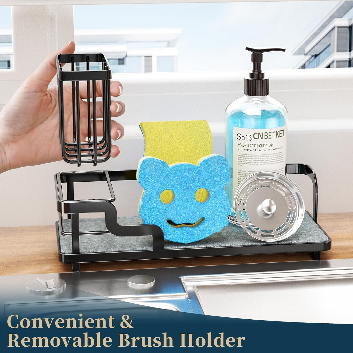 Consumest Sponge Holder for Kitchen Sink - Sink Caddy Organizer with Water Absorbing Stone Tray, Detachable Brush Holder, Stainless Steel Kitchen Counter Organizer Rack, Black