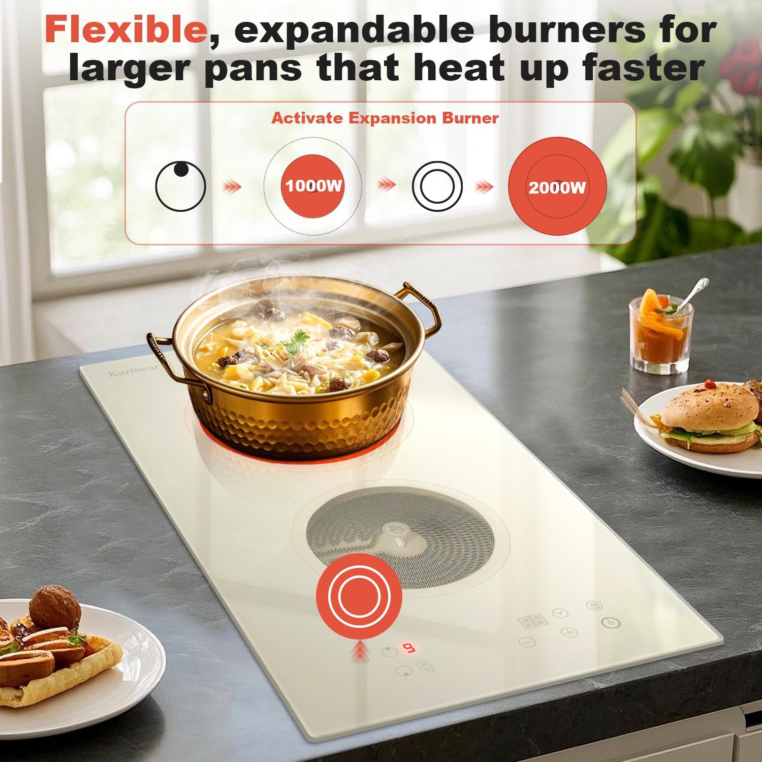 - 【Elegant Beige-gray Glass Desig】Transform your kitchen with the sleek and stylish Beige-gray glass electric cooktop. Its luminous surface, reminiscent of moonlight, adds a modern touch and elevates your space. This durable, heat-resistant glass is not only stunning but also smooth and easy to clean. Flush-mounted into your countertop, this 2 burner electric cooktop combines functionality with elegance.