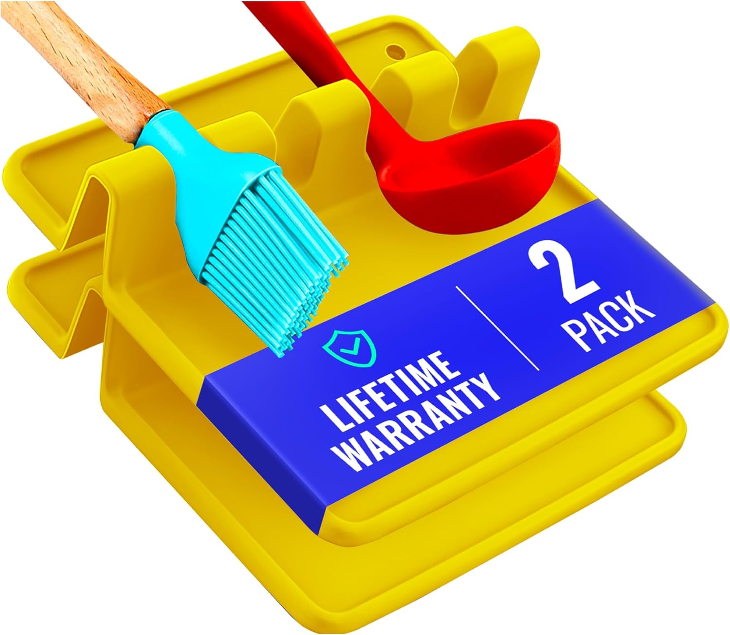 Silicone Spoon Rest for Stove Top with Drip Pad (Two Pack) - Heat Resistant BPA Free Utensil Rest & Spoon Holder for Kitchen Counter - Grill Utensil Holder - Spatula Holder, Tongs, Ladle - Yellow