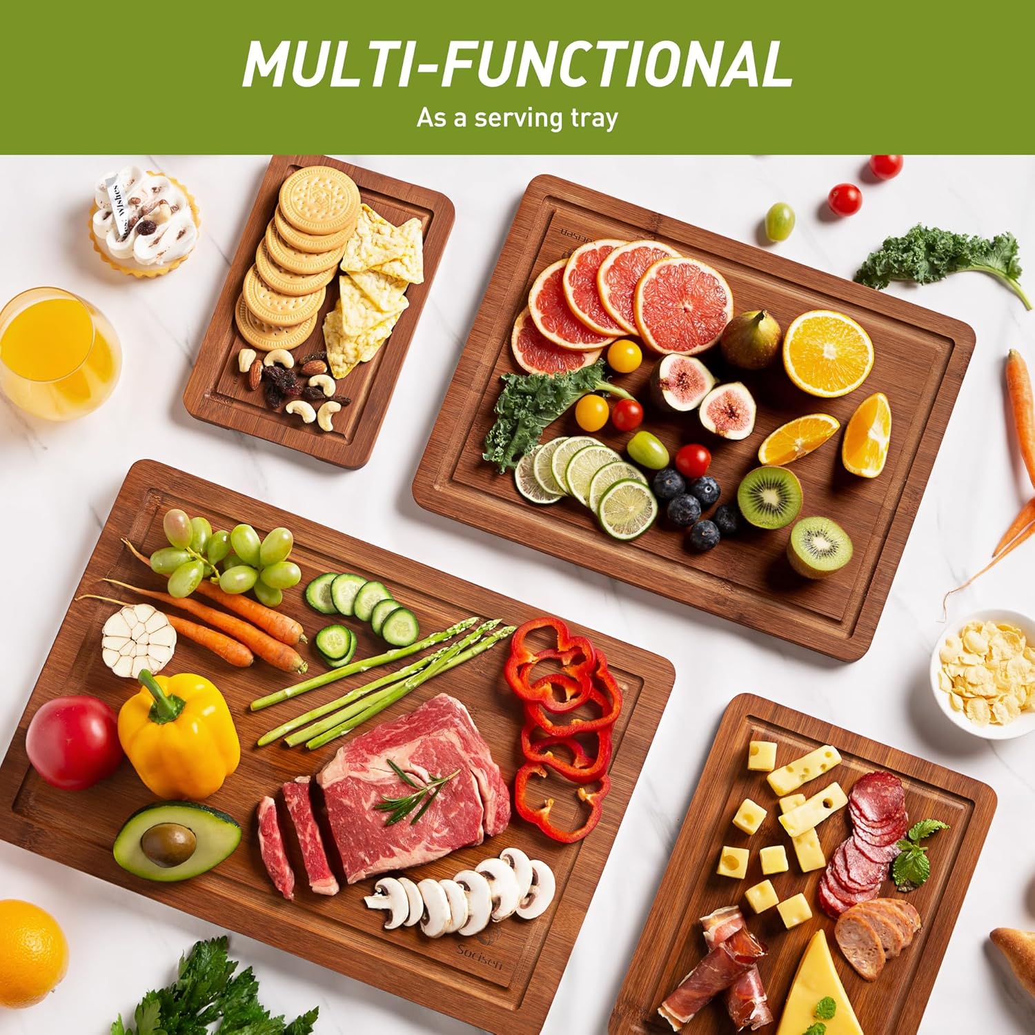 - Four Perfectly Sized for Versatile Use: Our bamboo cutting board set has four sizes – 9"x6", 11"x8.5", 14.5"x11" and 17.5"x12" . This set of 4 bamboo cutting boards are perfect for everyday food preparation, from slicing fruit to chopping veggies. Thoughtfully sized to fit different needs without taking up too much counter space. Whether dicing veggies, slicing fruits, or carving meats, there's a chopping board for every occasion. Perfect for various kitchen tasks and charcuterie boards.