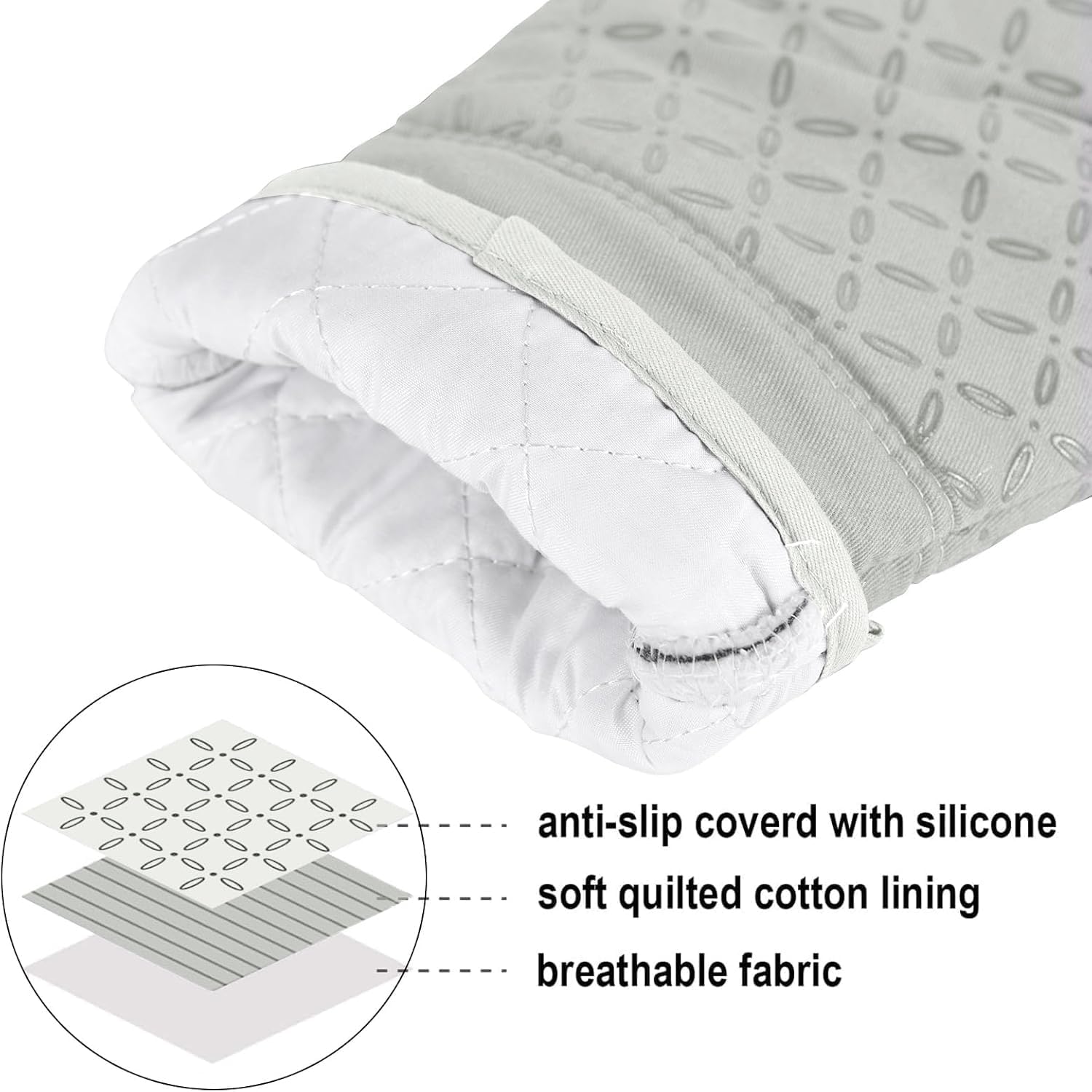- 500°F HEAT RESISTANT &NON-SLIP: This oven mitts heat resistant 500 degrees because of the durable construction so it can effectively keep you protected from burning while you enjoy cooking and grilling. Enhanced with anti-slip silicone design to provide a more robust, non-slip grip that can be held securely when handling the kitchen utensils