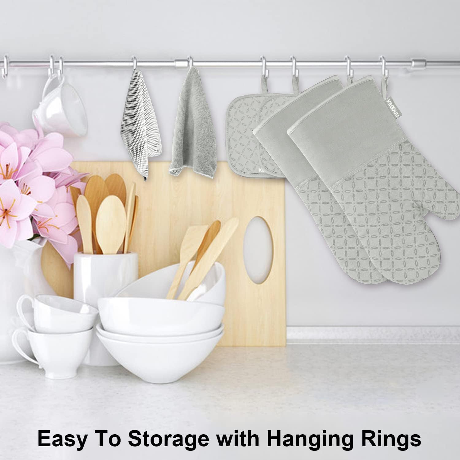 - EASY TO STORE: The kitchen oven mitts and pot holder come with rope design, so it is easy to store and hang them via the suspension rings when you are not using, save your room and make your kitchen look more cleaner