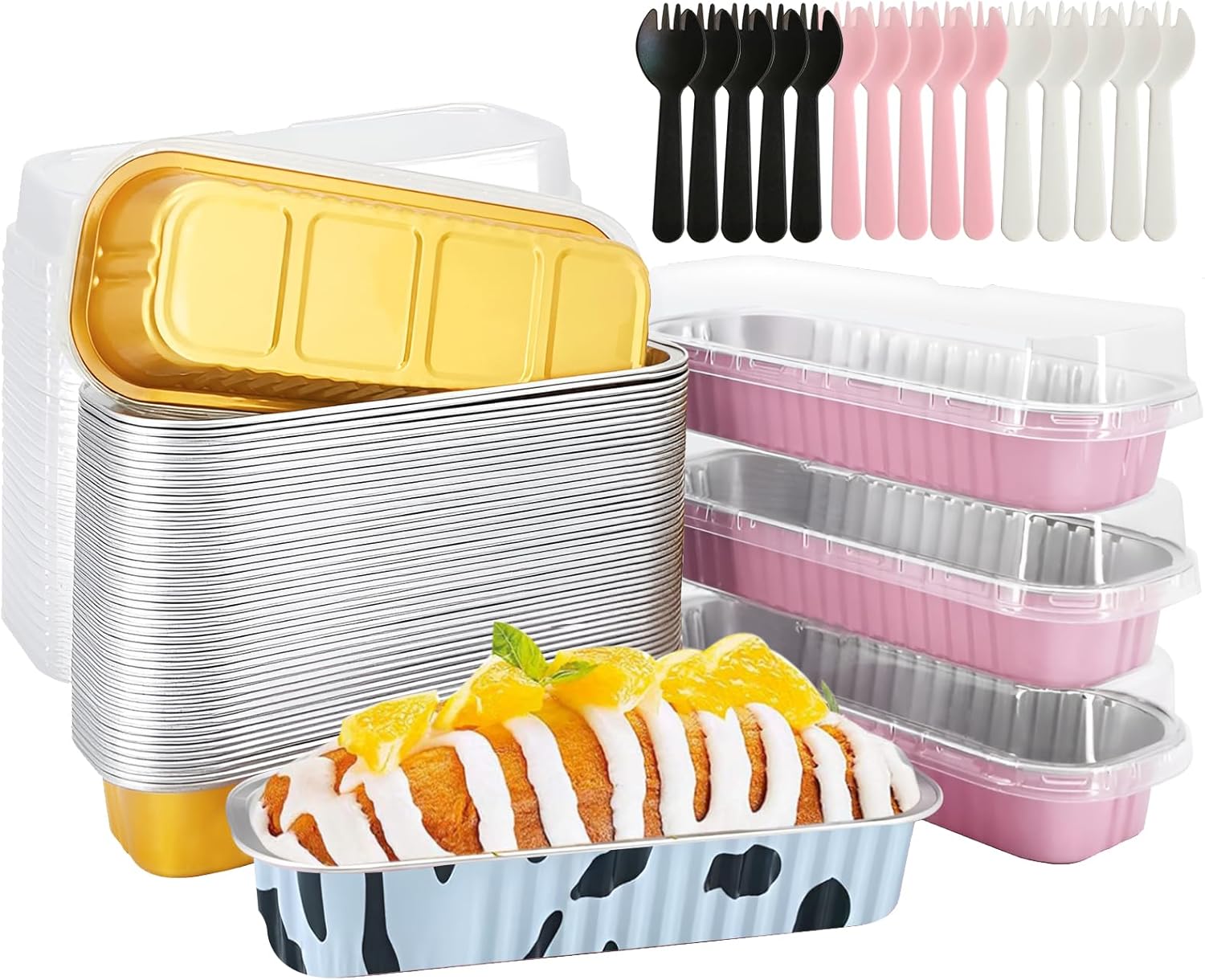 50 PCS Multiple colors Mini Loaf Pans with Lids and Spoons, 6.8oz Mini Cake Pans for Baking, Disposable Aluminum Foil Loaf Pans, Loaf Baking Pans for Party Individual Serving.