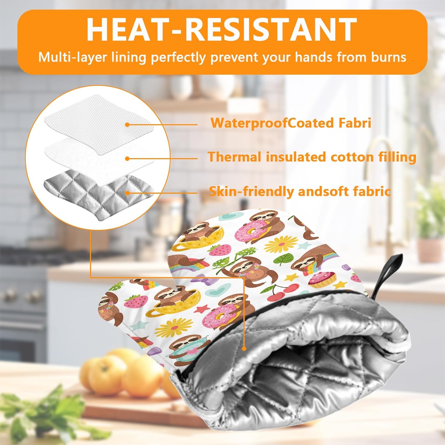 Cute Sloth Oven Mitts and Pot Holders Sets 4Pcs,Extra Long Oven Gloves Potholder for Kitchen Cooking Baking BBQ 100% Cotton Heat Resistant