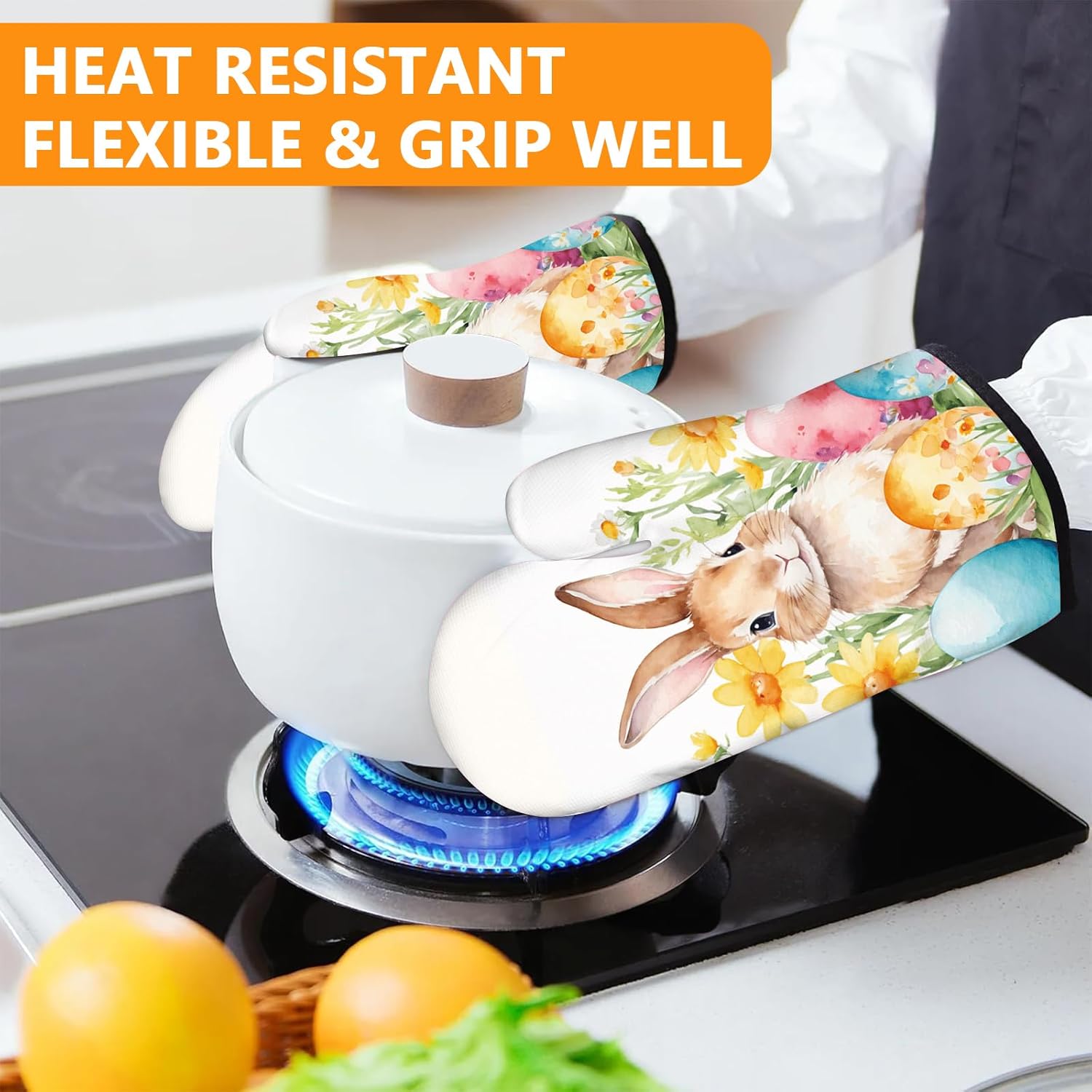 Easter Rabbits Oven Mitts and Pot Holders Sets 4Pcs,Extra Long Oven Gloves Potholder for Kitchen Cooking Baking BBQ 100% Cotton Heat Resistant