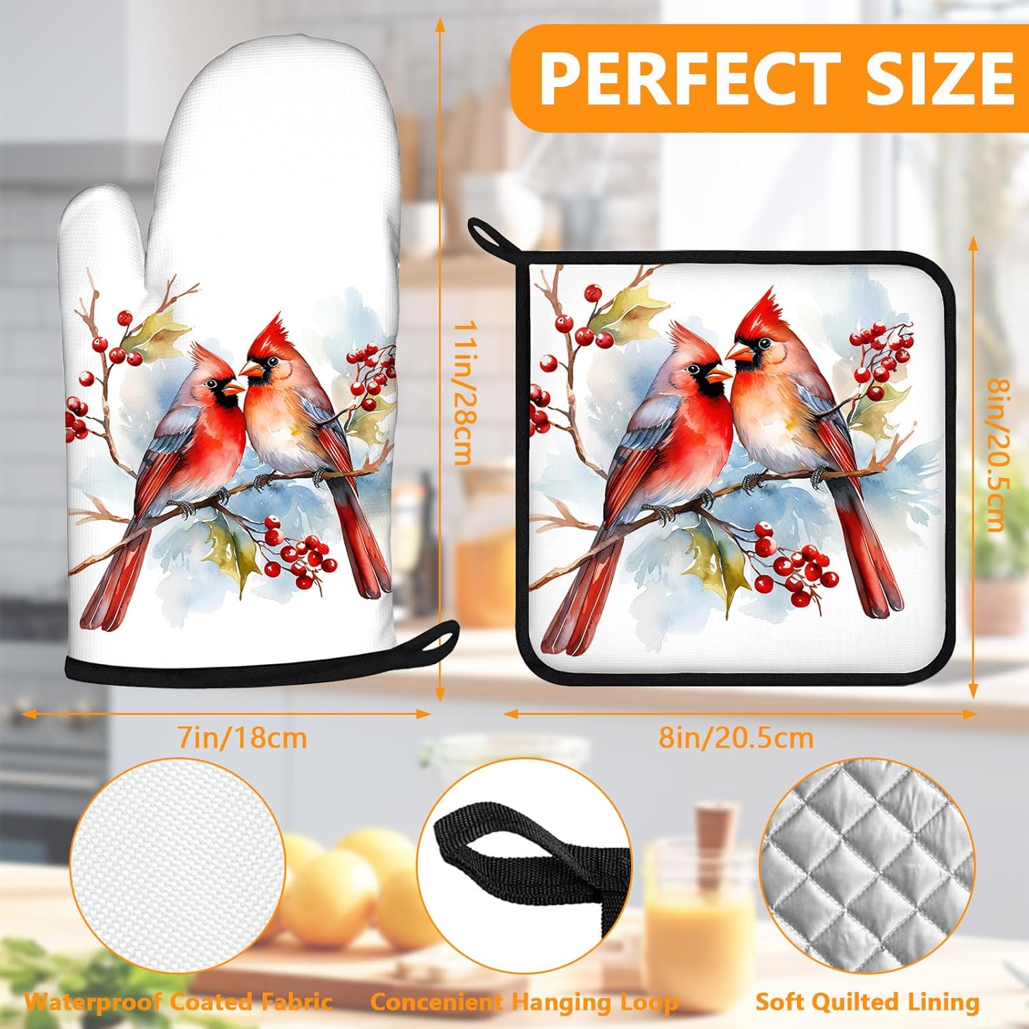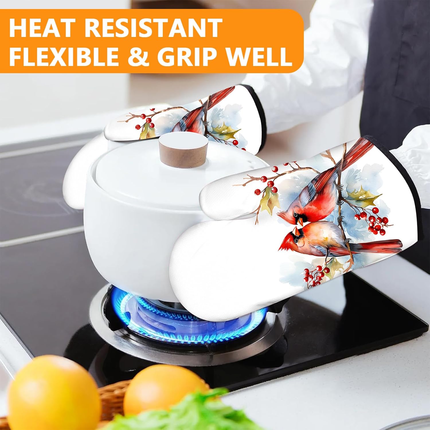 Red Cardinal Birds Oven Mitts and Pot Holders Sets 4Pcs,Extra Long Oven Gloves Potholder for Kitchen Cooking Baking BBQ 100% Cotton Heat Resistant