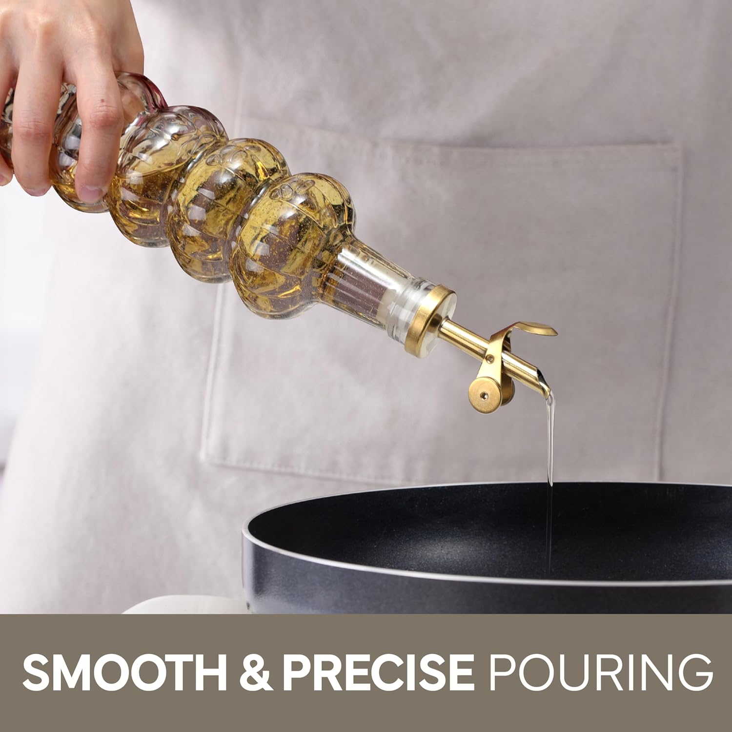 - Beautiful and Functional - Our colored glass oil dispensing bottles, with elegeant colors, gold tops and gold wire rack, will elevate your kitchen. Don't use just any oil bottle, upgrade the way you cook. That's our mission.