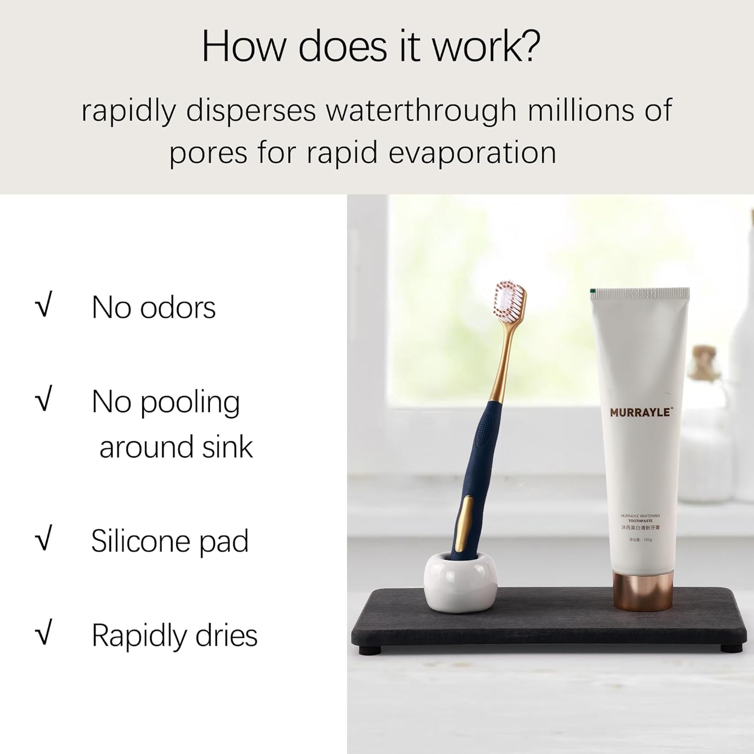 - Made from natural Diatom mud and plant fiber, small holes within diatomite enable it have amazing water absorption. They could absorb water and gets dry in a few minutes. It makes the Bathroom Counter top more dry and tidy.