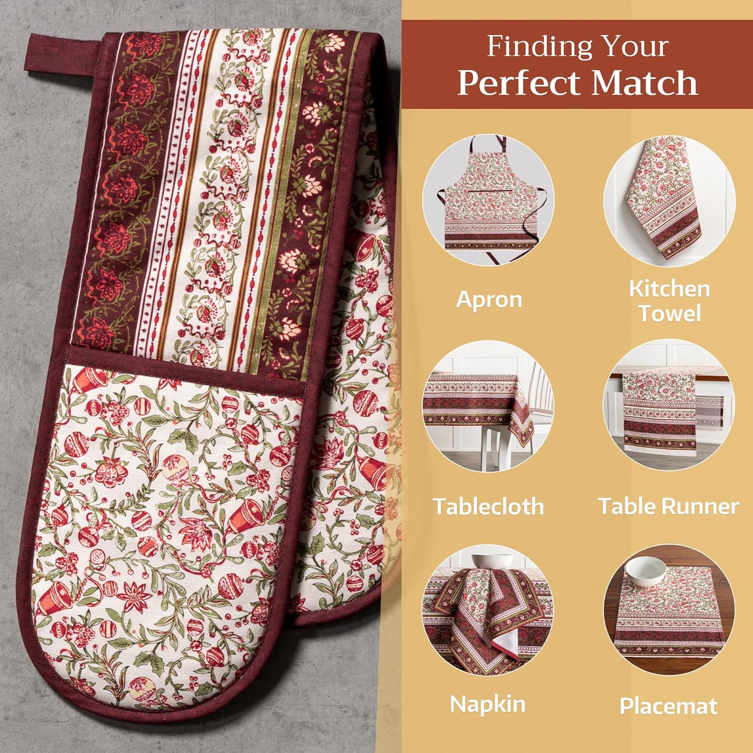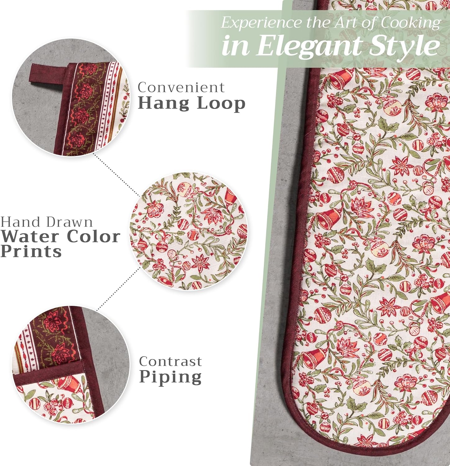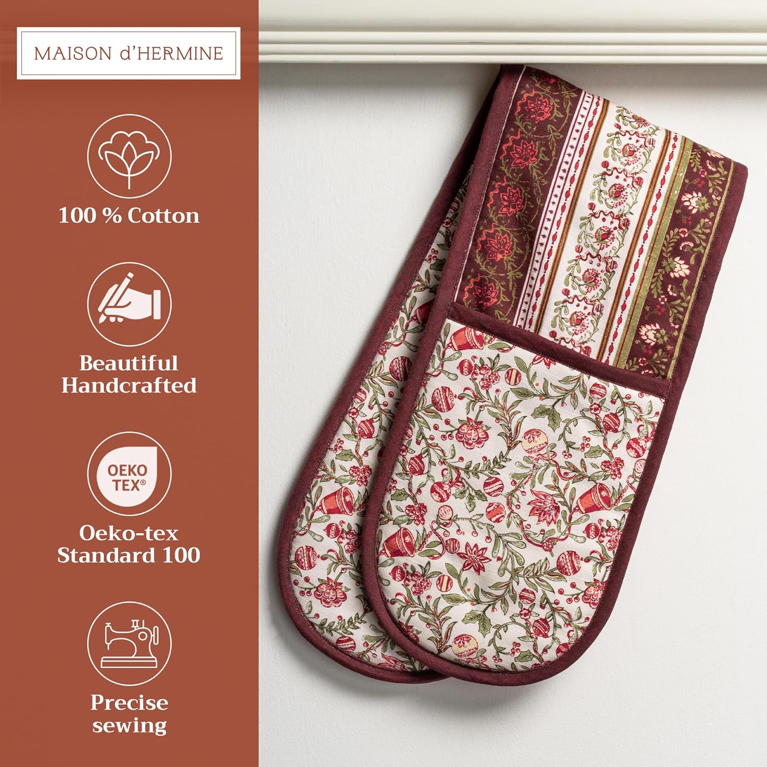 Maison d' Hermine Double Oven Mitts 100% Cotton 7"x35" Double Oven Mitt Heat Resistant BBQ Cooking Gloves with Loop, Baking, Grilling, Home, Kitchen, Handling Hot Pans (Reveillon Au Jardin)