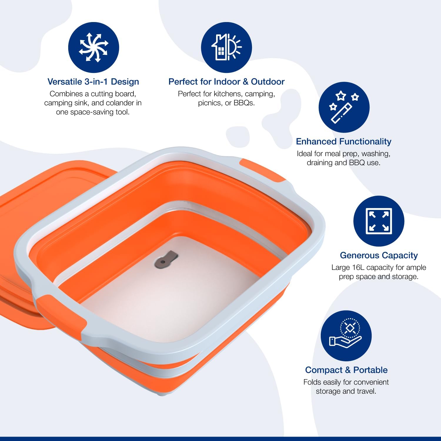 - BBQ Marinate, Drain & Prep – Made from food-safe materials, this tub lets you marinate meats mess-free, drain excess liquids with the built-in strainer, and prep food on the sturdy cutting board. The collapsible design saves space, and it's easy to carry for effortless grilling.