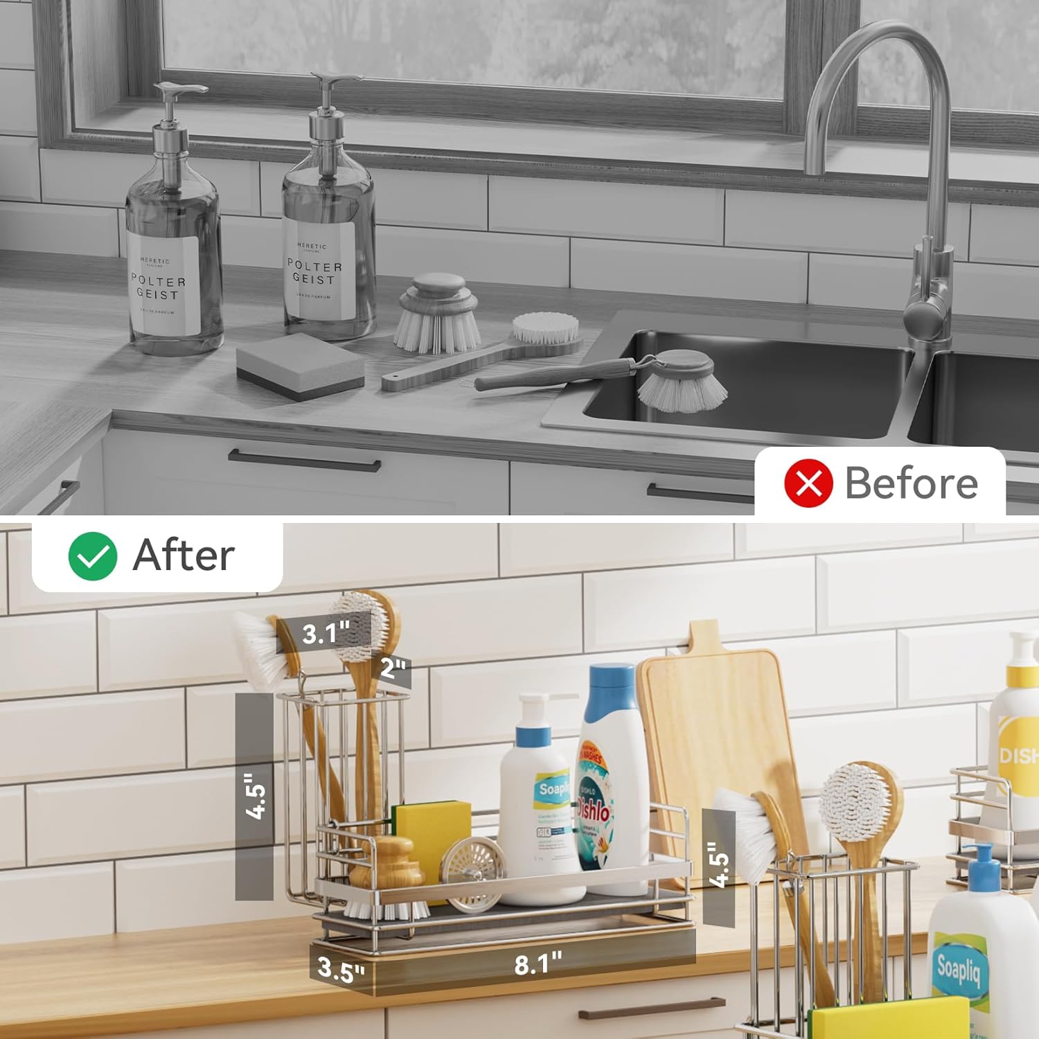 - 【Large Storage Capacity】The Yofidra sink box measures 8.1x3.5x4.5 inches and can hold cleaning bottles, sponges, dishwashing brushes, long handled brushes, and more