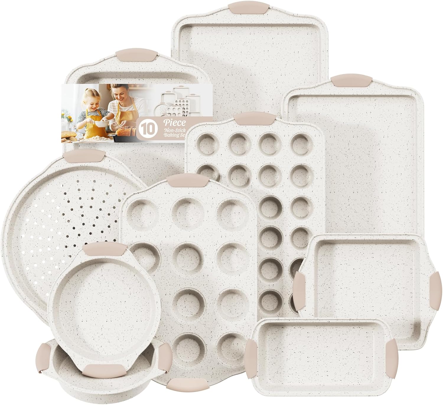 10-Piece Baking Pans Set Nonstick, Stackable Bakeware, Toxin-Free Baking Pans Set with Silicone Handles, Includes Cookie Sheets, Cake Pan, Loaf Pan, Pizza Pan, Muffin Pan, White&Khaki