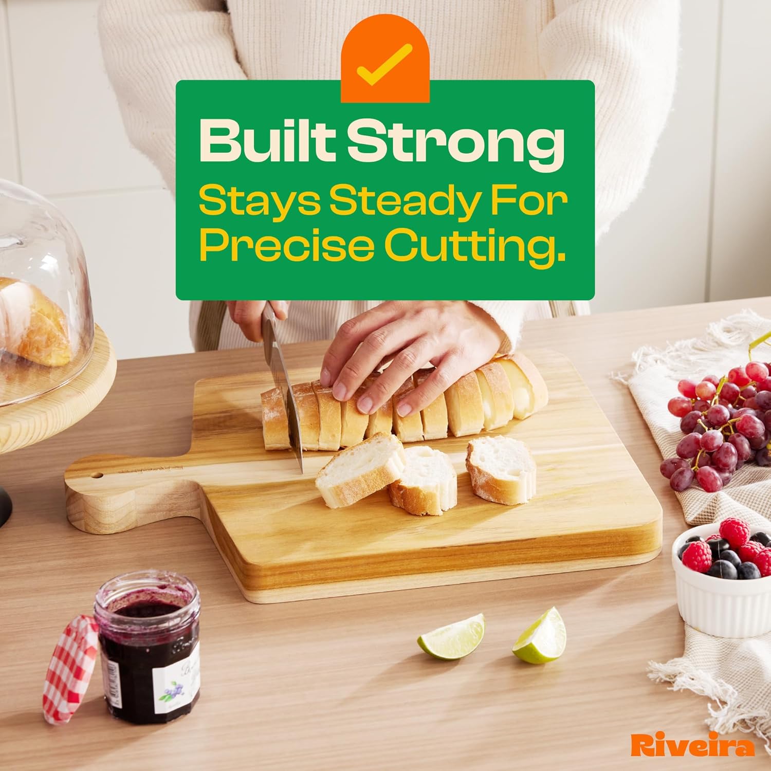 - Premium Crafted Teak — Take a detour from traditional kitchen aesthetics with this teak wood board crafted from 100% natural teak. Beyond being an unconventional and eco-friendly choice, the chopping board wood proudly showcases the environment friendly and organic teak. This wood cutting boards for kitchen counter adds an unexpected touch of confidence and style to your once-orderly culinary space. Riviera's wooden chopping boards for kitchen will be there for you for many years to come.