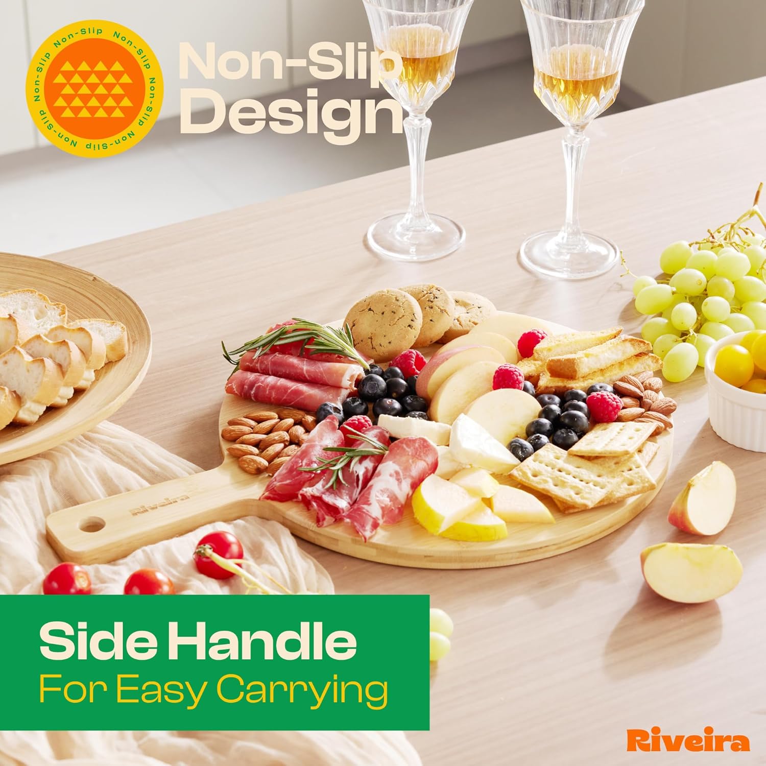 - Premium Crafted bamboo — Take a detour from traditional kitchen aesthetics with this two tone bamboo wood board crafted from 100% natural bamboo. Beyond being an unconventional and eco-friendly choice, the chopping board wood proudly showcases the environment friendly and organic bamboo. This wood cutting boards for kitchen counter adds unexpected touch of confidence and style to your once-orderly culinary space. Riviera's wooden chopping boards for kitchen will be there for many years to come.
