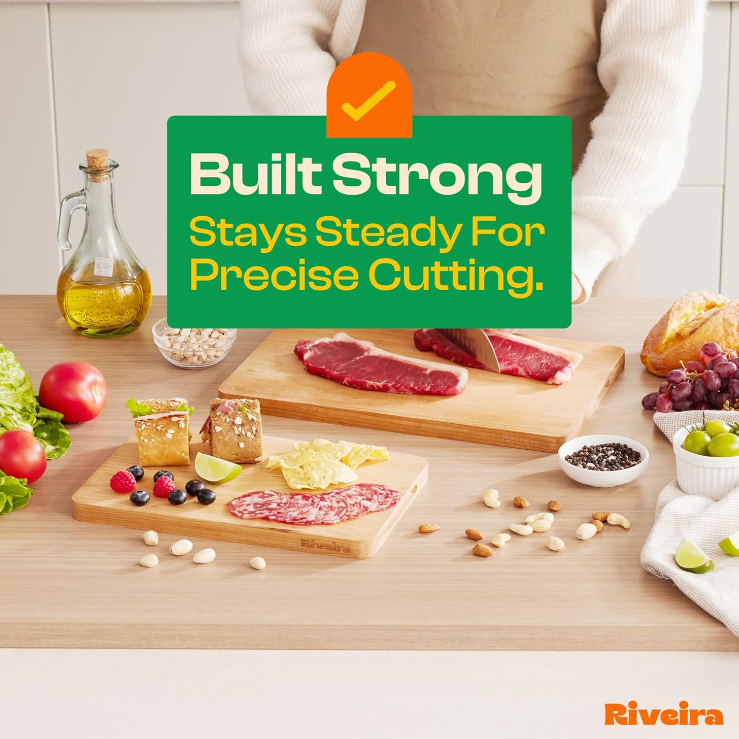 - No Mess Cutting and Transfer — Enjoy a mess-free kitchen with our large cherry cutting board. Equipped with deep juice grooves, these cutting boards for kitchen wooden catch liquid runoff from meat, fruit, and other ingredients, preventing spills and countertop messes. Whether you're working in an industrial restaurant kitchen or your home, this end grain cutting board cherry makes cleanup a breeze. Transfer ingredients from your prep station without any fuss with Riveira large cutting boards.