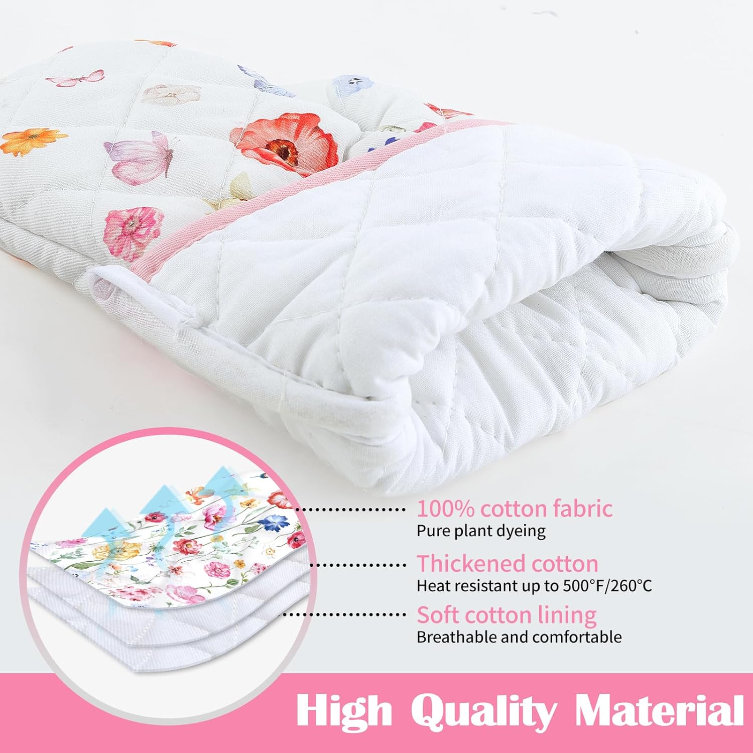 Wildflower Oven Mitts and Pot Holders Sets 2Pcs, 100% Cotton Heat Resistant, Extra Long Oven Gloves Potholder for Kitchen Cooking Baking Decoration
