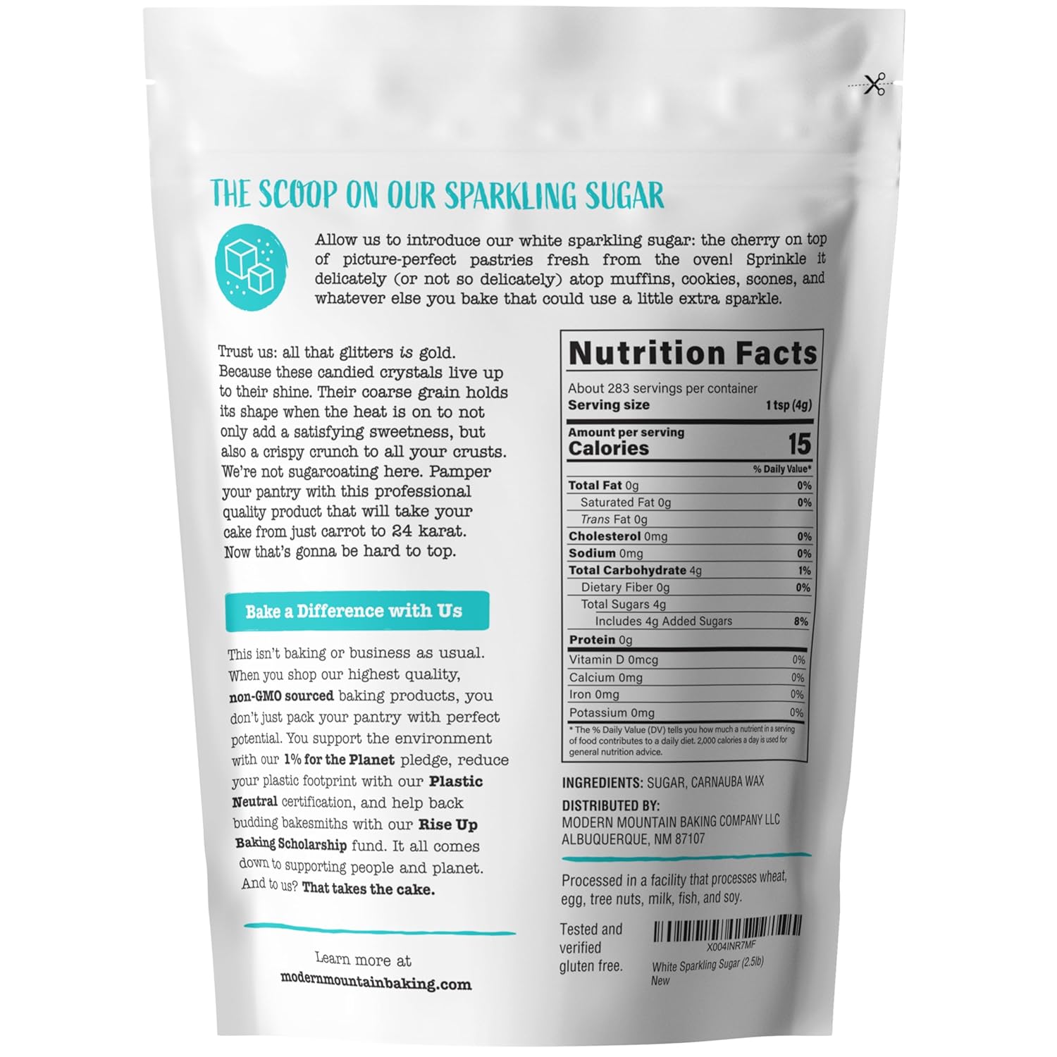 - PARTAKE IN PREMIUM, PROFESSIONAL QUALITY: At Modern Mountain, we pride ourselves on carrying the highest quality baking products around. No matter what you’re adding a little razzle dazzle to, you can rely on us to pack your pantry with products that we source non-GMO, test and verify gluten free claims, and never pad with artificial colorants or additives. The same is true of our white sanding sugar, of course, which are the brightest, most brilliant sparkle sugar crystals available.