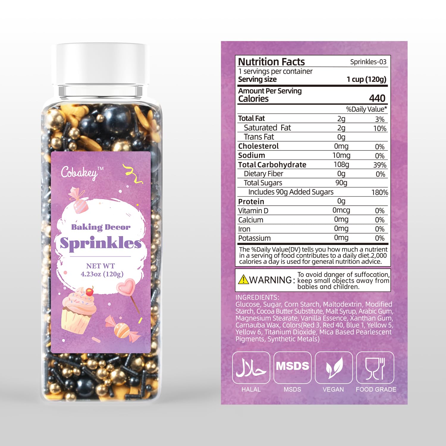- Pearl Sprinkles: Each bottle weighs 4.23oz, 120g. Our black & gold sprinkles are made from safe ingredients. Our cake sprinkles are in different shapes of Crown and Pearl Sprinkles.