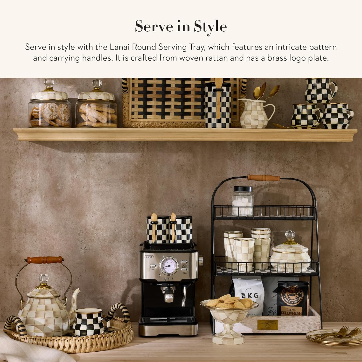 - ELEGANT SERVING ESSENTIAL: The Lanai round decorative tray features an intricate pattern of contrasting woven rattan in shades of black and brown. Use it to create a basket-decor centerpiece in the living room, bedroom, kitchen, bathroom, or patio.