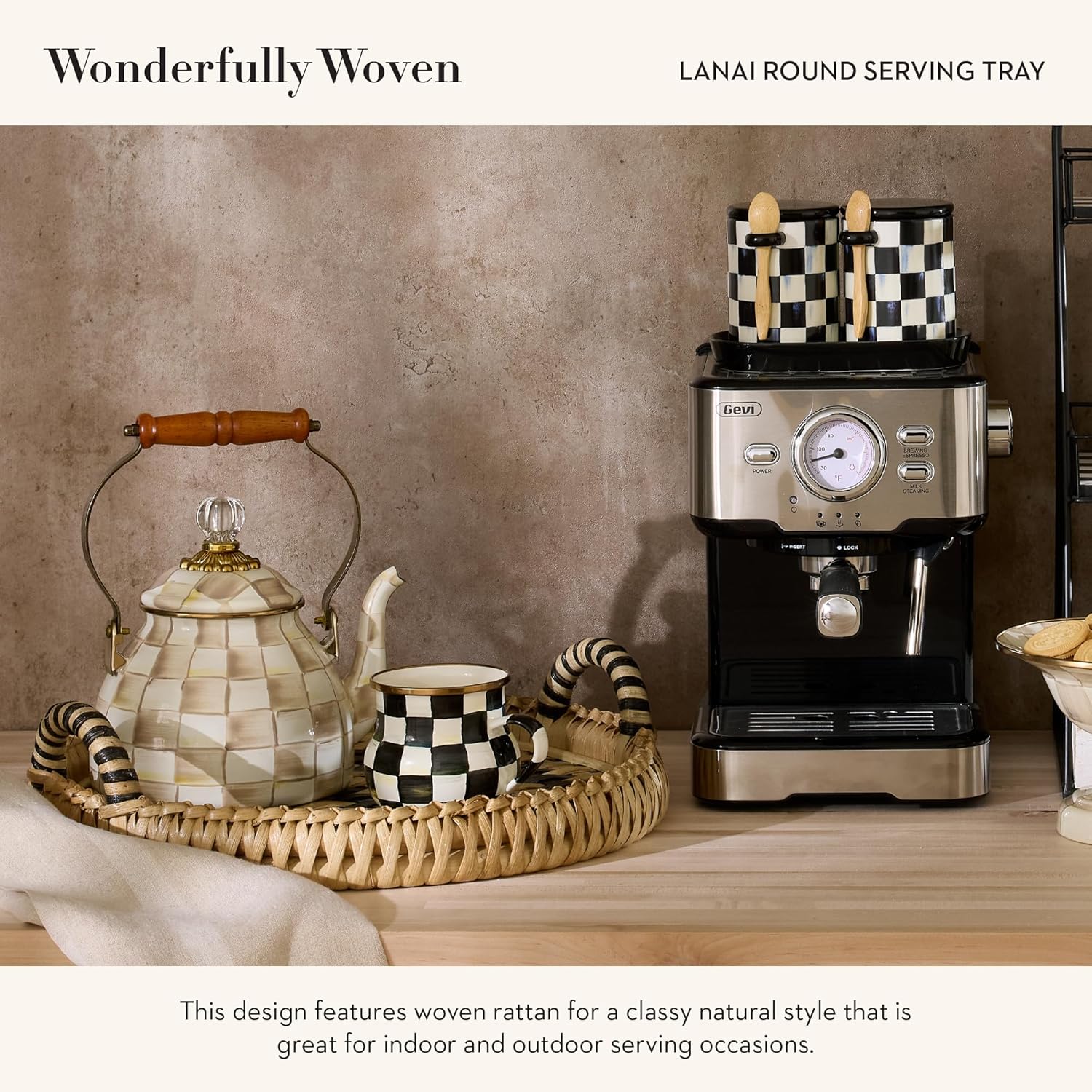 - UNIQUE ROUND TRAY WITH HANDLES: Our Lanai round tray with carrying handles makes any summer party a breeze. Handy as it is handsome, this fancy woven tray is ideal as an indoor or outdoor serving tray for year-round entertaining.