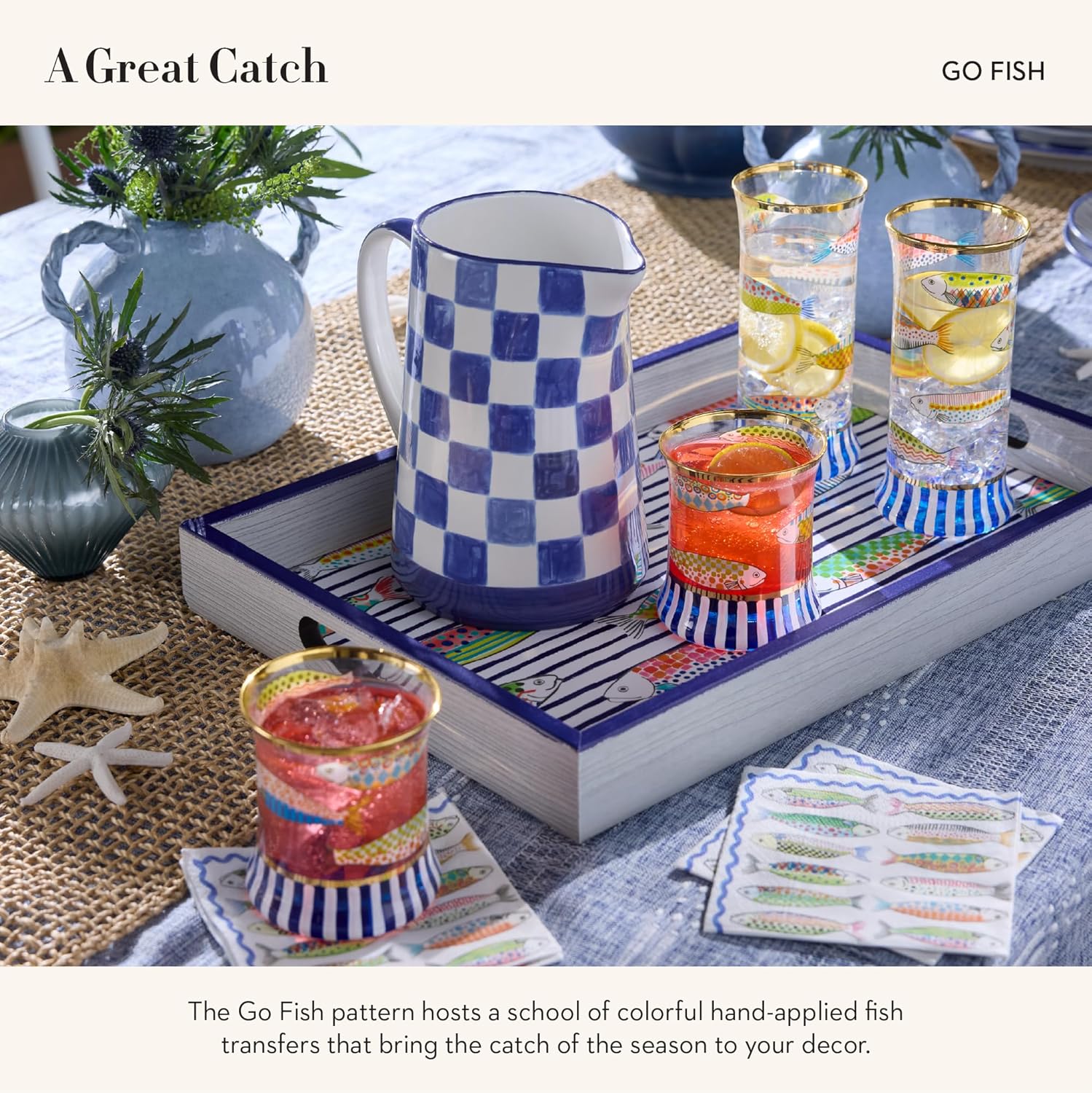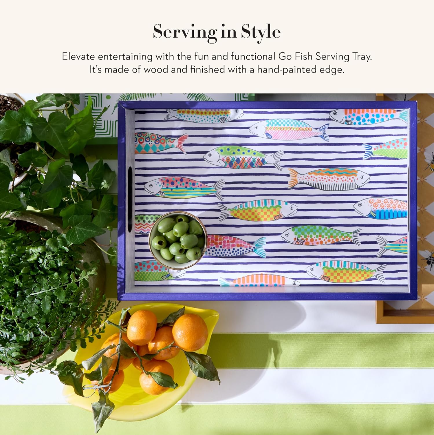 - ELEGANT ROOM ESSENTIAL: Display our colorful Go Fish tray anywhere. This wood serving tray features cutout handles, is decorated with hand-applied transfers, and is finished with a hand-painted edge.