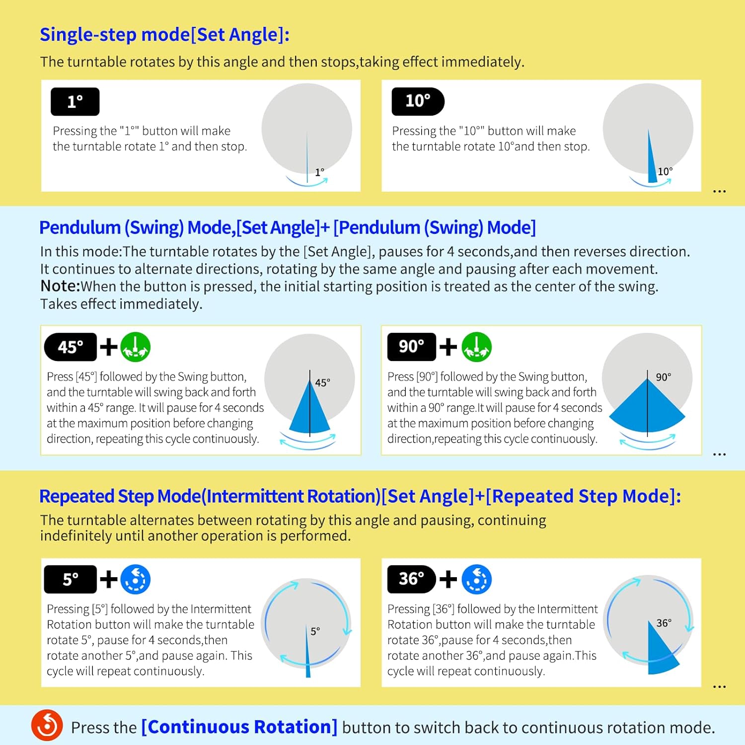 - 【This motorized turntable includes a Professional Flagship Remote Controller】:Precise angle settings and user-friendly combination key design enable support for a wider range of applications. Support: Set the current position as the origin point (used in conjunction with the "Return to Origin" button). Support: Save the current settings to the turntable's internal flash. More versatile angle buttons and mode button combinations provide greater flexibility for various applications